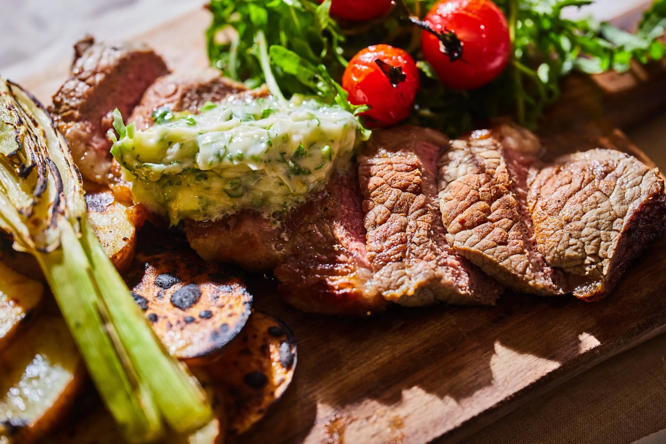Végül jöhet a tálalás: deszkára tesszük a krumplit és az édesköményt, mellé a rukkolát a paradicsommal, megcsorgatjuk olívaolajjal, majd jöhet a deszkára a lényeg, a vékonyan felszeletelt hús a fűszervajjal.