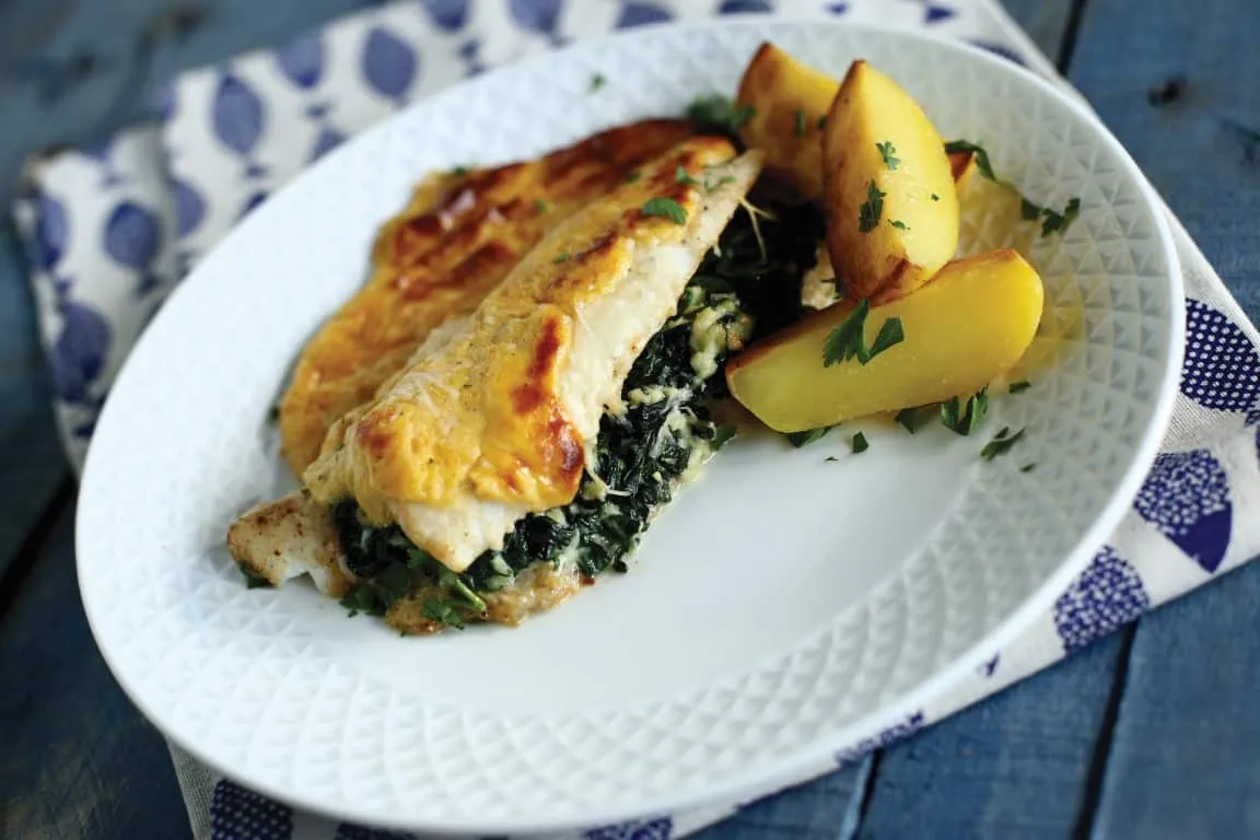 Húzzuk le a süllők bőrét. A süllő filét mindkét oldalán sózzuk be és fűszerezzük frissen tört borssal, majd kicsit pihentessük. Olvasszunk fel 1 evőkanál vajat, adjuk hozzá a zúzott fokhagymát, majd amikor elkezd pirulni, gyorsan öntsük fel a tejszín felével. Addig forraljuk, míg a tejszín tejföl állagúra sűrűsödik. Adjuk hozzá a bébispenótot, és folyamatos keverés mellett rottyanstuk meg, épp csak hogy a paraj összeessen. Egy serpenyőbe öntsünk 1-2 evőkanál olajat, majd adjunk hozzá egy evőkanál vajat. A süllőfiléket mindkét oldalukon mártsuk lisztbe, és 1-2 perc alatt süssük elő minden oldalukon. Amikor a színe kifehéredik és kicsit szilárdabb, akkor már jó. A kisütött halakat tegyük félre. Egy rozsdamentes tálba keverjük el a tojássárgáját a maradék tejszínnel, sózzuk, borsozzuk és reszeljünk hozzá a szerecsendióból, majd vízgőz felett sűrítsük mártás állagúra. Vegyük le a tűzről, és reszeljük hozzá a parmezánt. Négy elősütött halfilét tegyünk sütőpapírral bélelt tepsire, egymástól 5-10 cm távolságra. Osszuk el a halakon a bébispenótot, helyezzük rá a másik halszeletet és kanalazzuk rá a mártást. Reszeljünk még rá egy kevés parmezánt, és 200 fokra előmelegített sütőben süssük pirosra. Köretként vajban pirított főtt burgonyát adjunk mellé.