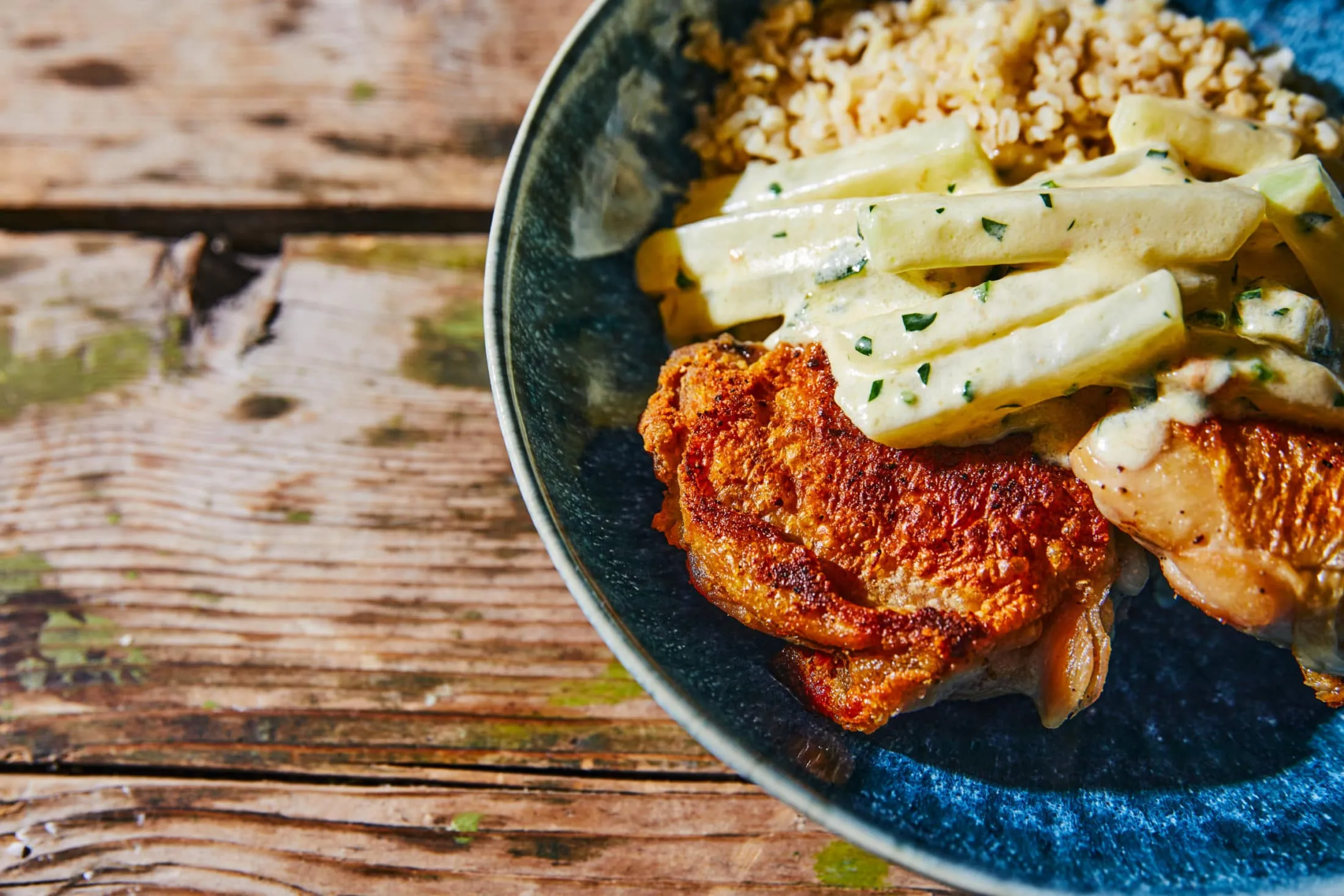 A sült csirkecomb karalábés vajmártással biztosan az asztal sztárja lesz, ha így készíted! A combokat megtisztítjuk, majd bőrrel lefelé, a közepesnél kicsit nagyobb hőfokon elkezdjük pirítani egy serpenyőben az olajon. Sózzuk, borsozzuk, majd amikor elkezdett pirulni a bőre, megfordítjuk a combokat, ismét sózzuk, borsozzuk, és lefedve 10-12 percig párolva sütjük. Fontos, hogy lefedjük, mert így keletkezik gőz, ami megpuhítja a combokat. Mikor letelt az idő, ismét megfordítjuk a húst, és 2-3 perc alatt szép ropogósra sütjük rajta a bőrt.