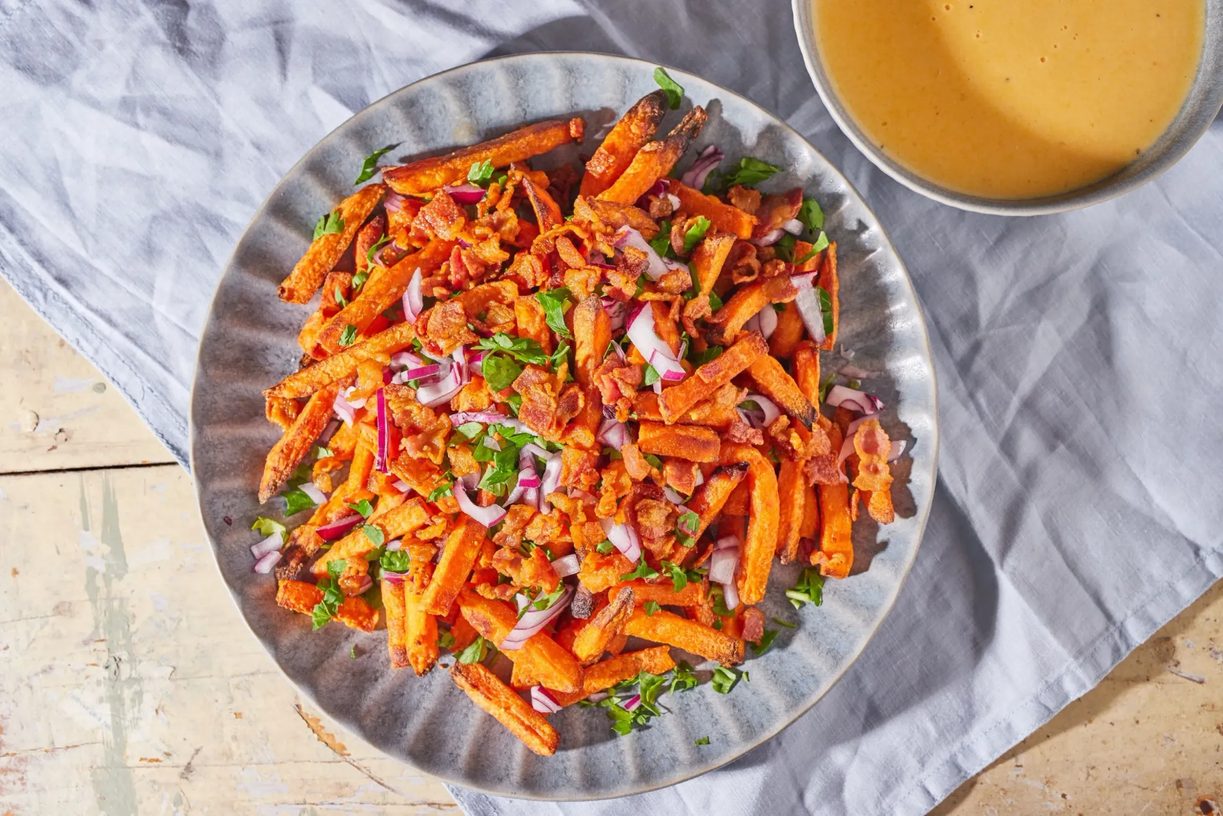 A bacont felkockázzuk, és egy száraz serpenyőben lepirítjuk. A hagymát és a petrezselymet apróra vágjuk. Tálaláskor a sült krumplit leöntjük a szósszal, és megszórjuk a többi hozzávalóval.