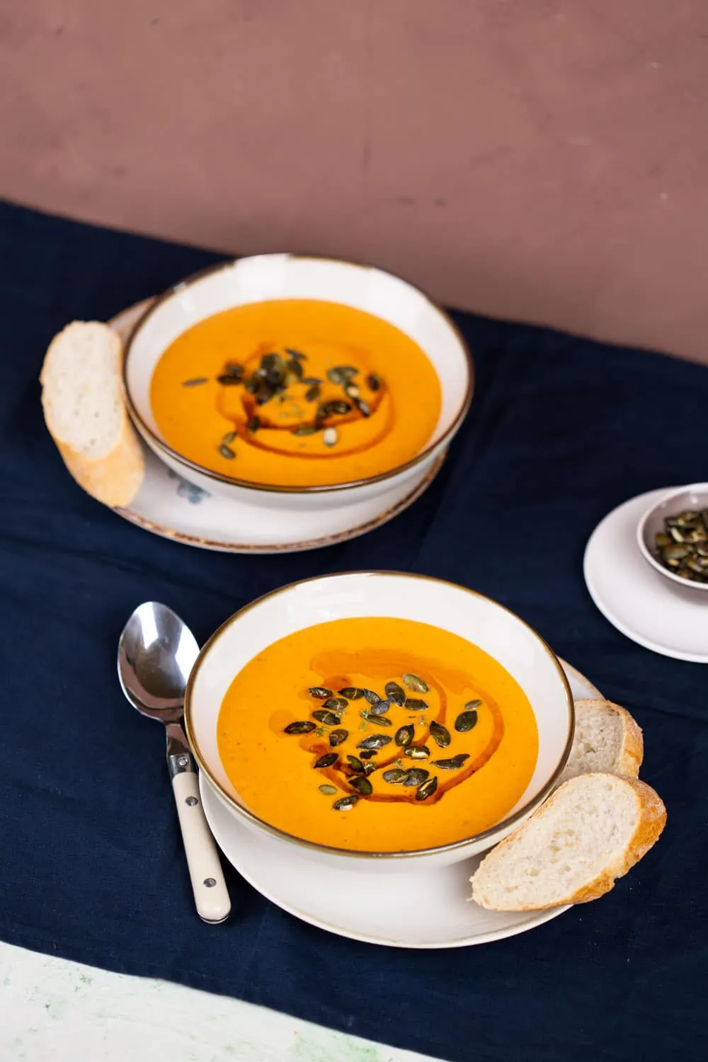 A chiliolajhoz az olívaolajban elkeverjük a kétféle paprikát. A levest chiliolajjal, kakukkfűvel, pirított tökmaggal és bagettel tálaljuk.
