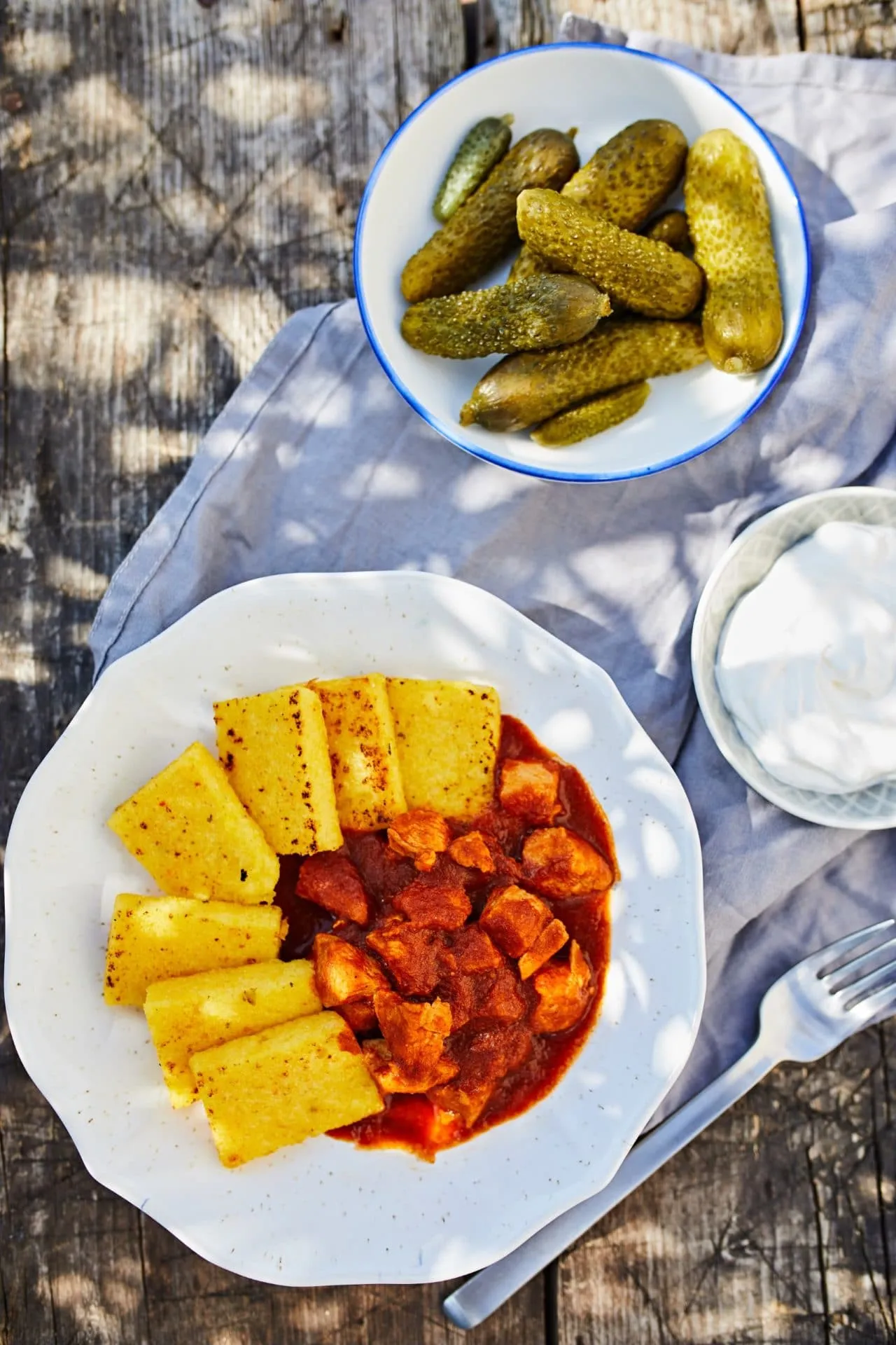 A pörkölthöz apróra vágjuk a hagymát és a fokhagymát, majd üvegesre pároljuk a sóval, borssal az olajon. Rárakjuk a sűrített paradicsomot, 2 percig pirítjuk, majd mehet rá a kétféle paprika, elkeverjük, és felöntjük egy kevés vízzel. Ha elforrt a lé, újra felöntjük, és ezt addig ismételjük, amíg a hagymás alap jól meg nem puhul. Ekkor leturmixoljuk, és felöntjük kb. 300 ml vízzel. Felforraljuk, belerakjuk az apró kockákra vágott csirkemellet, és 10-15 perc alatt megfőzzük. Közben, ha kell, pótoljuk a vizet. A polentát a pörkölttel, tejföllel és savanyú ubival tálaljuk.