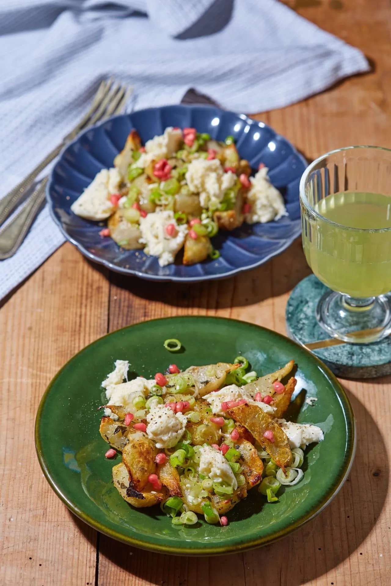 A csicsókát összeforgatjuk az ecettel. Vékonyra szeleteljük az újhagymát, nagyobb darabokra tépkedjük mozzarellát, és a sült csicsókát ezekkel és a gránátalmával tálaljuk.