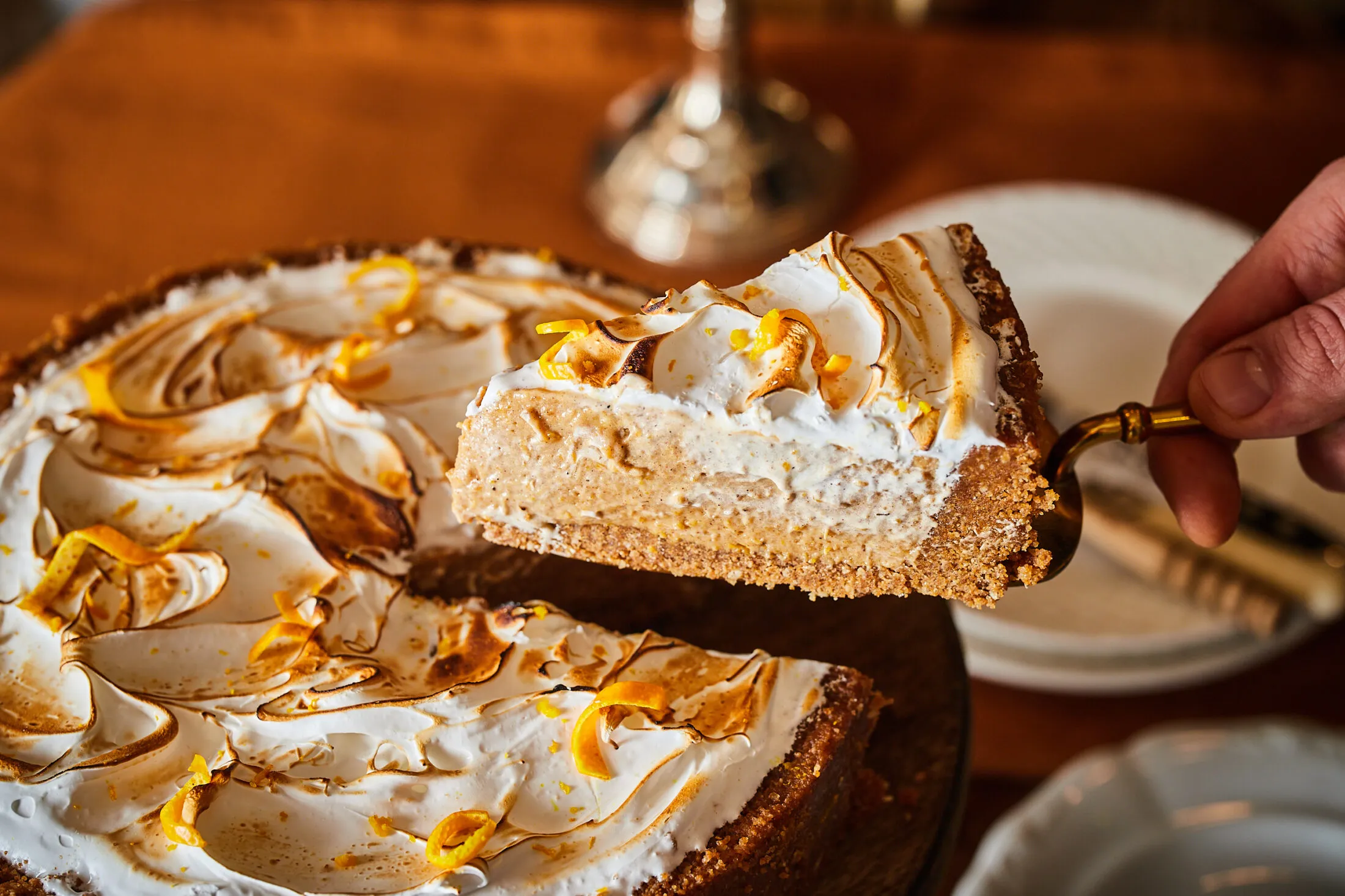 A kész meringue-et habzsákba töltjük és a kihűlt, pihentetett tortánk tetejére nyomjuk. Egy kanállal belenyomkodunk a meringue-be, majd kiemeljük, ezzel egy rusztikus díszítést érünk el. Szakácsfáklyával megkapatjuk a meringue-et, hogy szép aranybarna csíkok legyenek a tetején. A kész sütőtökös pitét narancshéjforgácsokkal díszítjük.