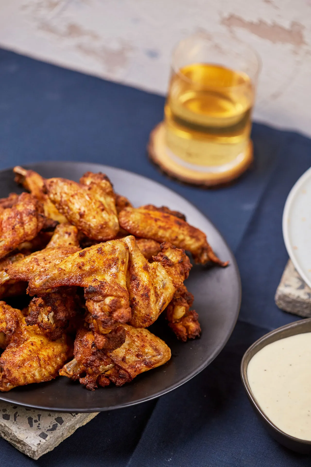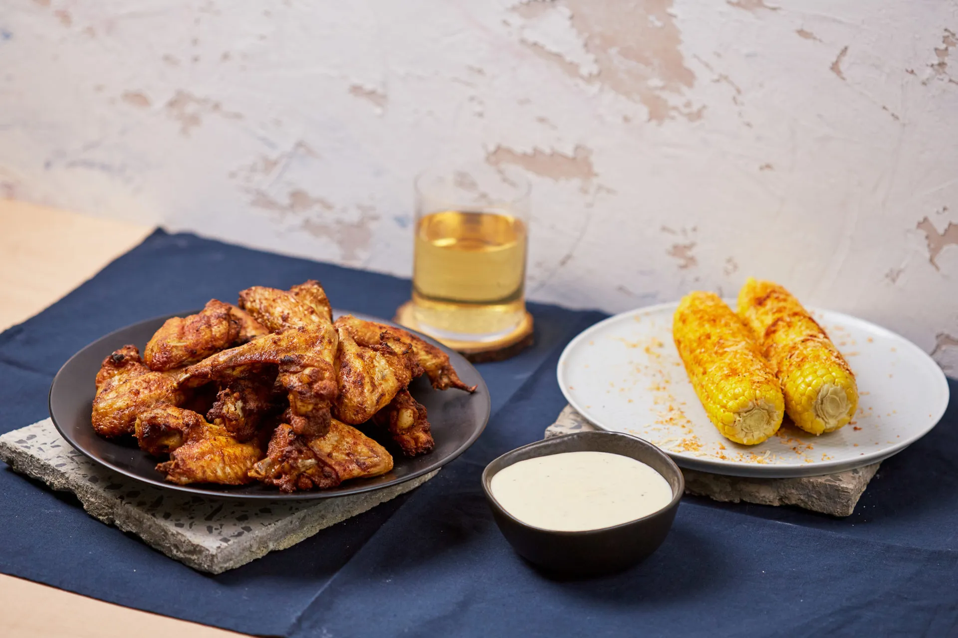 A csirkeszárnyakat a kukoricával és a mártással tálaljuk.