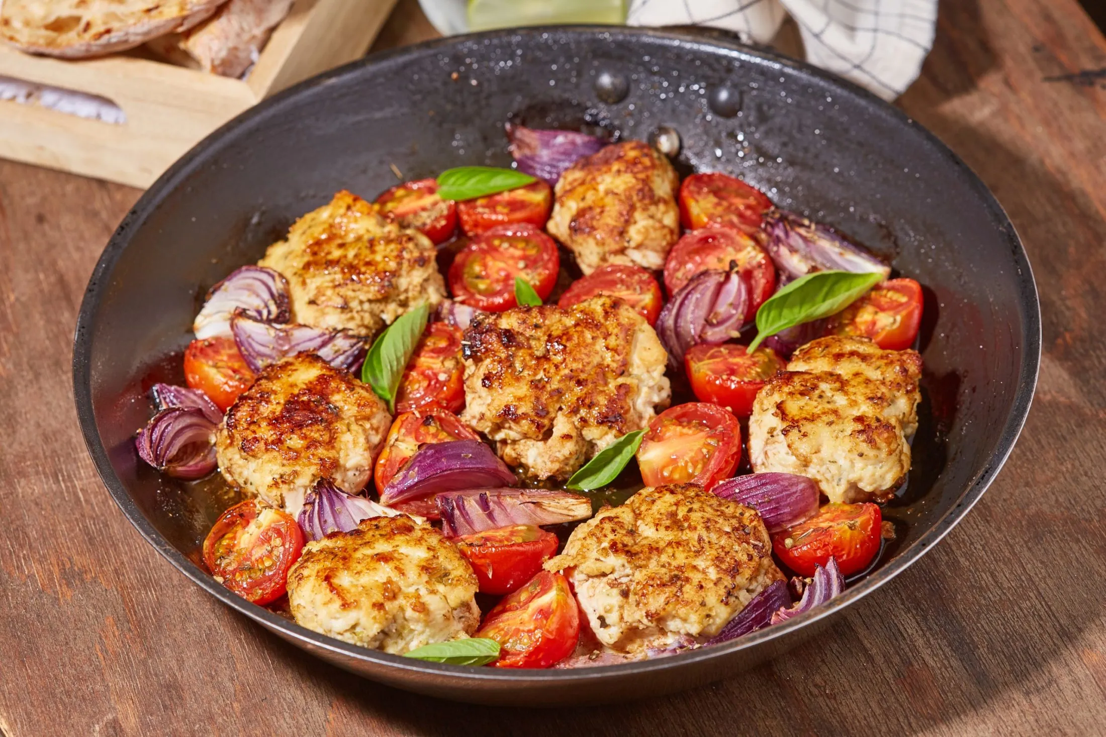 Az olaszos csirkehúsgolyók készítésekor a csirkemell felét az összes hozzávalóval lezúzzuk, a maradék csirkemellet kb. 1 cm-es kockákra vágjuk és összekeverjük a kettőt. 2-3 evőkanál olajon egy nagyobb serpenyőben, amit a sütőbe is be tudunk tenni, körbepirítjuk a gombócokat, majd rádobjuk az elfelezett koktélparadicsomot, cikkekre vágott lilahagymát, az egészet meglocsolojuk egy kevés olívaolajjal, 2 evőkanál balzsamecettel és 200 fokos sütőbe tesszük 25 percre. Pirított ciabattával és friss bazsalikommal tálaljuk.