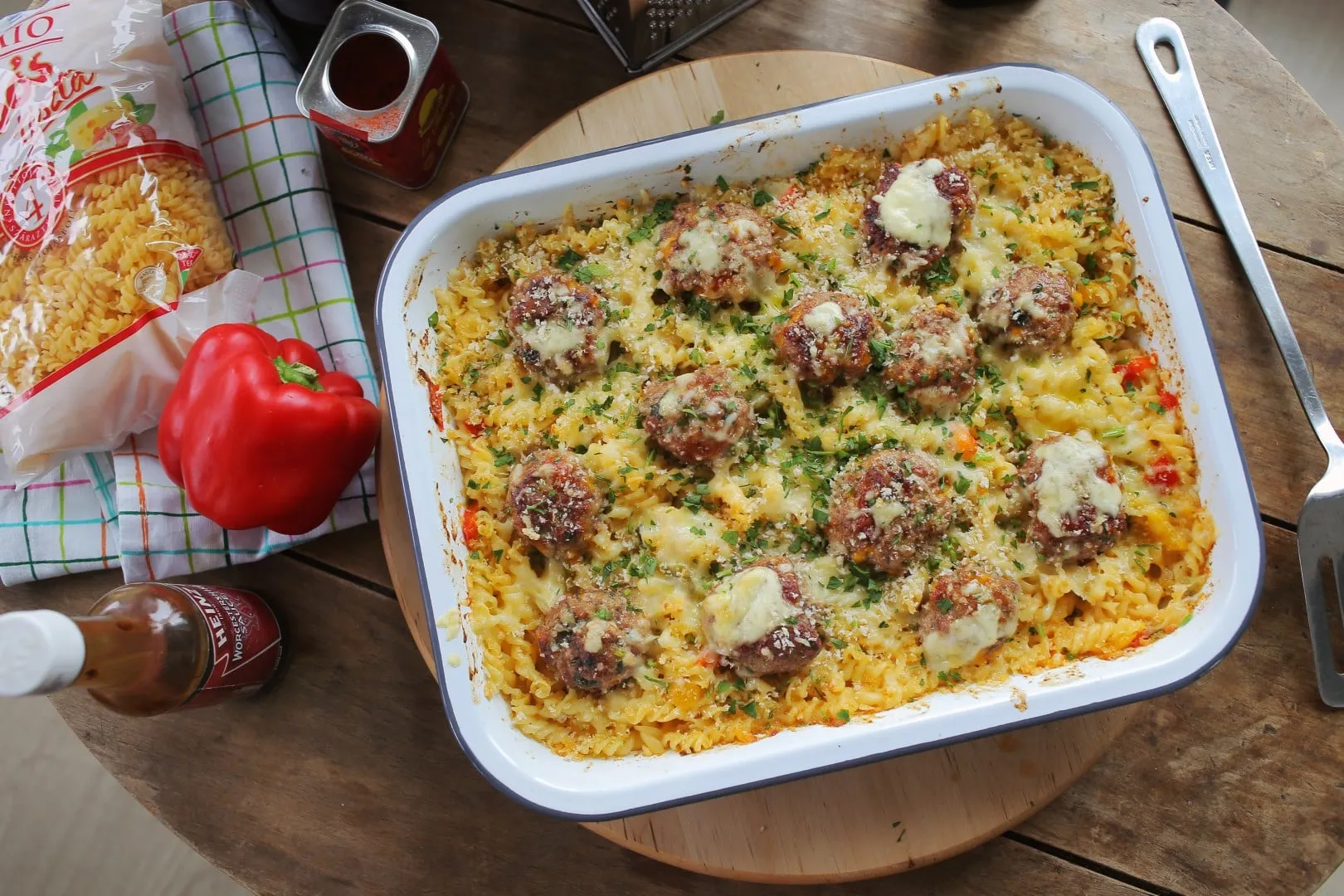 A fűszerek között láthattok két olyan darabot itt, amik nem feltétlenül találhatóak meg minden közért polcain. De ha rendszeres Street Kitchen nézők vagytok, akkor tudjátok, hogy ezekből érdemes berendelni egy kisebb adagot valamilyen fűszerboltból és akkor elvagytok vele egy ideig. Próbáljátok ki a receptet és küldjetek nekünk fotót a végeredményről!Először elkészítjük a húsgolyókat. Ehhez a darálthúst egy tálba tesszük, majd beízesítjük: sózzuk, borsozzuk, hozzáadjuk a fűszernövényeket, a Worcester-szószt és a fokhagymát finomra aprítva. A sajtból kisebb kockákat vágunk és ezt is hozzákeverjük a húshoz. Közepes méretű golyókat formázunk belőle ügyelve arra, hogy mindegyikbe jusson a sajtkockákból. Egy serpenyőben olajat hevítünk és kisütjük benne a húsgolyókat, amiket aztán letakarva félreteszünk és hozzálátunk a tészta elkészítéséhez.A tésztát sós, forró vízben főzni kezdjük, és amíg elkészül, összedobjuk a mártást. Egy lábasban olajat hevítünk, majd ezen üvegesre pirítjuk a vöröshagymát. Erre jön a finomra vágott fokhagyma, a felkockázott kápia paprika és a szintén kis kockákra vágott cukkíni. Pirítunk egyet a zöldségeken, majd jöhet a tejszín, amihez még hozzáadunk egy keveset a tészta főzőlevéből. Majd rottyantunk rajta egyet, hogy szép, mártásos állagot kapjunk.A tésztát ne főzzük teljesen készre: az al dente állapotnál is kicsivel keményebb tésztát borítsuk egy hőálló tálba és öntsük rá a kész mártást. Forgassuk össze az egészet jó alaposan, majd jöhetnek rá a húsgolyók. A tetejére reszelünk rengeteg sajtot és 180 fokos sütőben éppen addig sütjük (kb 10-15 perc), amíg a sajt szépen rásül a tésztára.