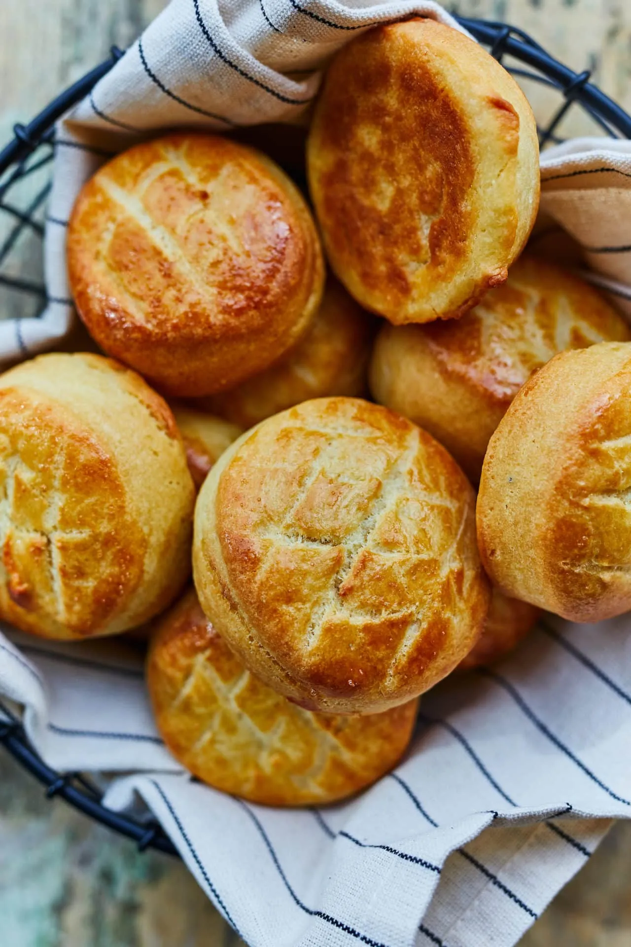 A krumplit sós vízben puhára főzzük, leszűrjük, és még melegen áttörjük. Miután kihűlt, az összes többi hozzávalóval együtt jól összegyúrjuk: ha minimum 5 percig gyúrjuk, brutálisan szép, egyenletes tésztát kapunk. Ezután 2 cm vastagra nyújtjuk, és 5-7 cm átmérőjű pogácsaszaggatóval kiszaggatjuk. Tepsire rakjuk, lekenjük tojással, bekarcoljuk a tetejét, és 180 fokra előmelegített sütőben 25 perc alatt megsütjük.