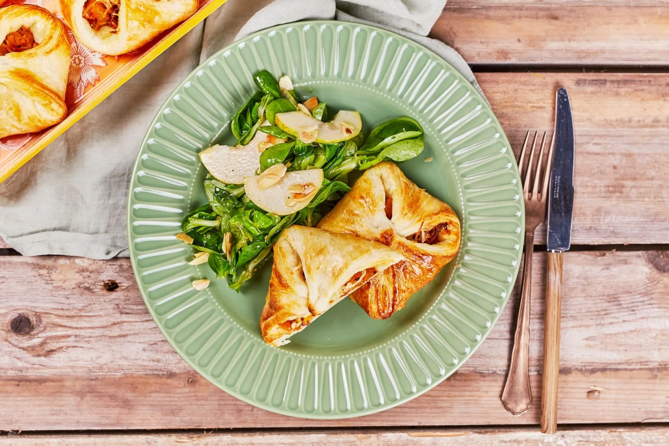 Közben a salátához a körte magházát eltávolítjuk, meglocsoljuk egy kis citromlével, vékonyan felszeleteljük, és összekeverjük a többi hozzávalóval. A dresszing hozzávalóit egy kis üvegben összerázzuk, és ráöntjük a salátára. A batyukat ezzel tálaljuk.