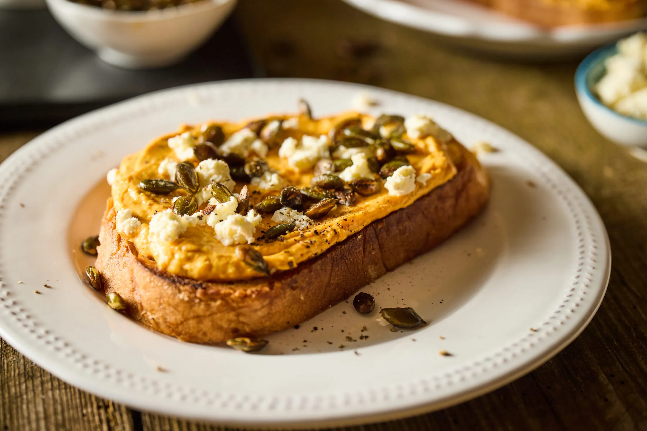 A kenyereket megkenjük a krémmel, megszórjuk a tökmaggal és feta sajtot morzsolunk rá.