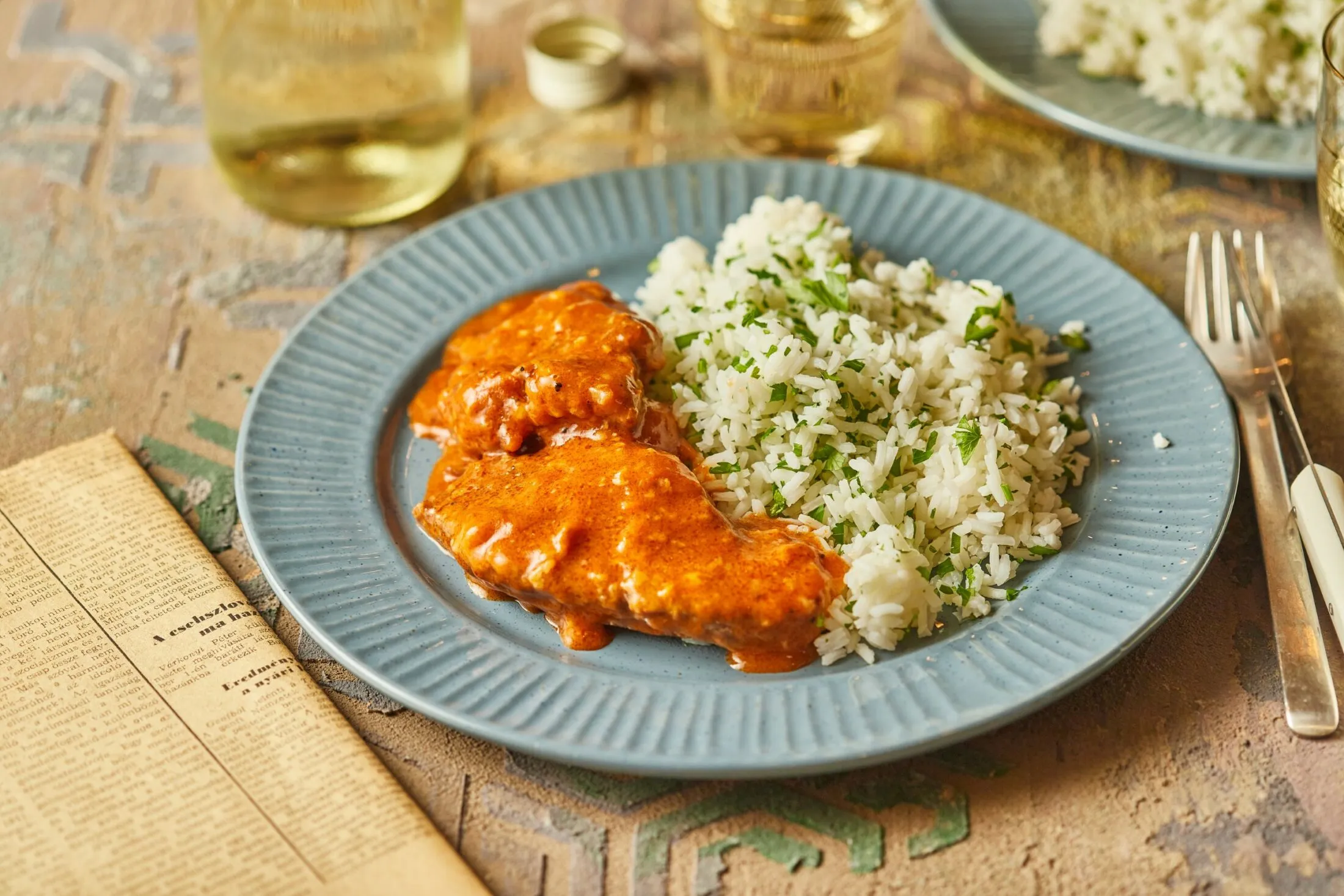 A visszamaradt zsíron, közepes hőfokon 1-2 perc alatt lepirítjuk a zúzott fokhagymát. (Fontos, hogy ne legyen túl forró a zsír, mert könnyen megég a fokhagyma.) Hozzáadjuk a sűrített paradicsomot, kb. fél perc alatt lepirítjuk azt is, majd felöntjük a húslevessel, visszatesszük a szaftba a hússzeleteket, lefedjük és kb. 10 perc alatt készre pároljuk. Petrezselymes rizzsel vagy tetszőleges körettel tálaljuk.