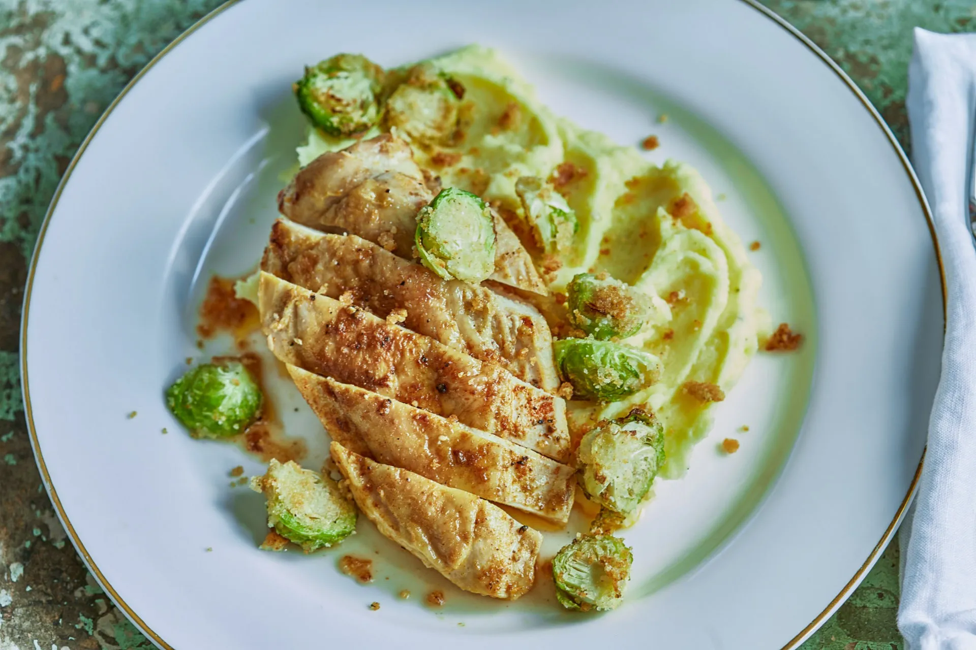 Amíg a csirke sül, pürésítjük a krumplit. Egy kis edényben összemelegíjük a vajat és a tejszínt, és a krumplihoz adjuk. Sóval, borssal és szerecsendióval ízesítjük.
