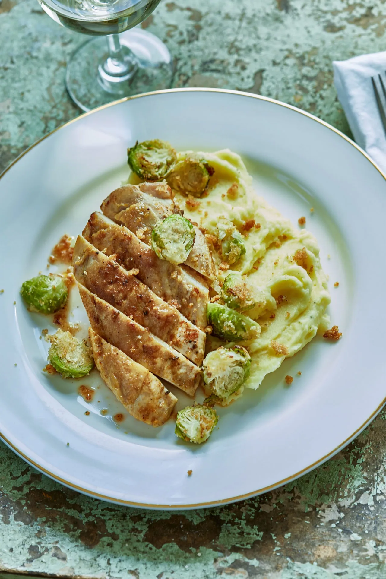 A megtisztított, félbevágott kelbimbókat összeforgatjuk 1 ek olajjal, és hozzáadjuk a fűszereket, a reszelt parmezánt és morzsát. Egy tepsire sütőpapírt teszünk, vékony rétegben kiolajozzuk, és amíg a csirke pihen, addig berakjuk a 200 fokra előmelegített sütőbe. 12-15 perc alatt készül el a kelbimbó, az idő vége felé érdemes csekkolni, hogy a kisebb darabok ne égjenek meg.