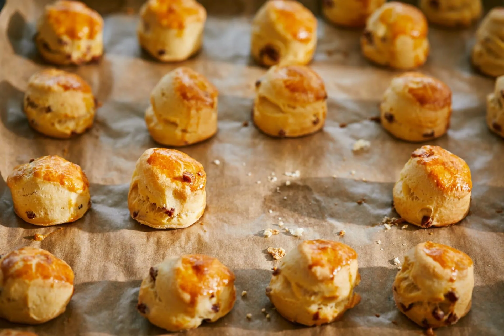 Lisztezett deszkán 1-1,5 cm vastagra nyújtjuk, és kb. 2,5 cm-es pogácsaszaggatóval kiszaggatjuk. Sütőpapíros tepsire tesszük őket, 20 percet kelesztjük, lekenjük a tetejüket lazán felvert tojássárgájával, és 180 fokra előmelegített sütőben 15-20 perc alatt készre sütjük.