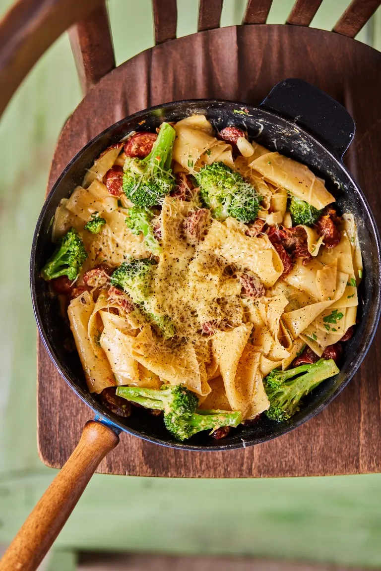 Egy nagyobb serpenyőben vajat hevítünk és rádobjuk a leszűrt csuszatésztát és folyamatosan ügyelve arra, hogy nehogy leégjen finom kérget pirítunk rá. Rádobjuk a kolbászt, fokhagymát, brokkolit, a csíkokra vágott szárított paradicsomot, ráöntjük a tejszínt meg az alaplevet és alaposan összeforgatjuk őket. Mehet rá a kétféle reszelt sajt és azonnal tálaljuk.
