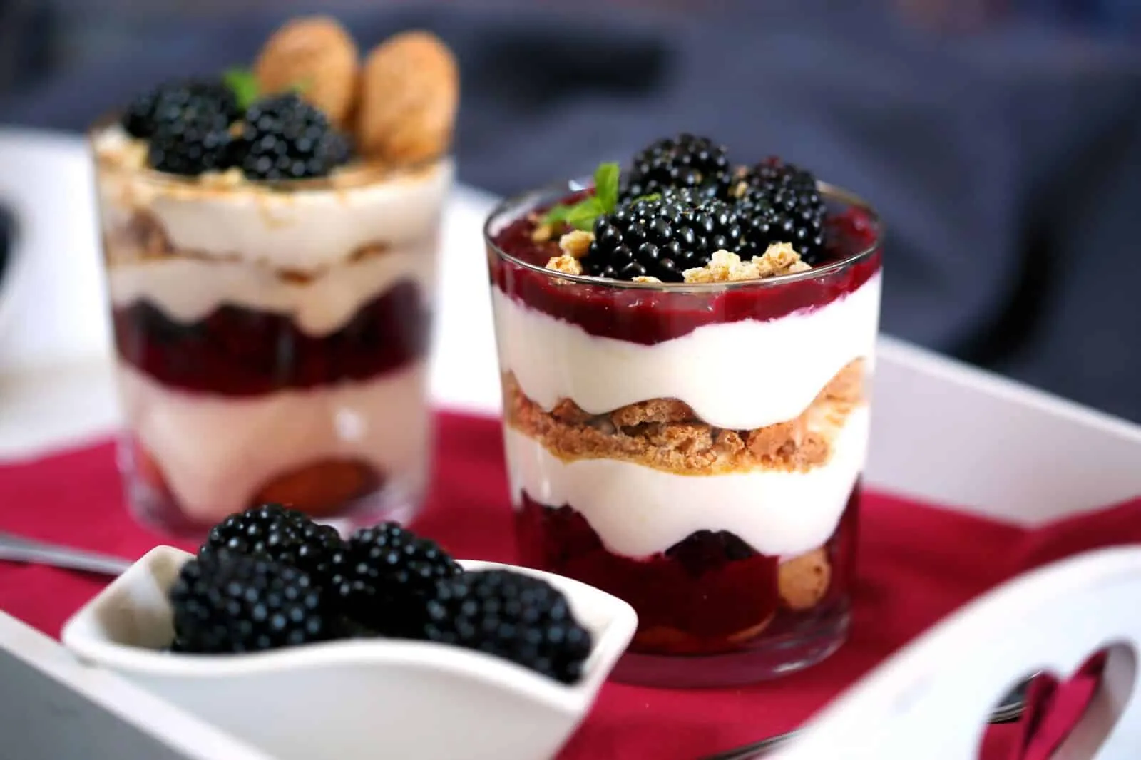 Tudjátok mennyire szeretjük a pohárdesszerteket...Meg a szedret is, szóval nagyon örültünk az ütős, görög joghurtos desszertnek, amit felturbóztunk egy jó kis szederpürével. Természetesen ha ti még ennél is jobban rajongtok a fekete málnáért, akkor annyit tehettek a tetejére, amennyi csak jól esik.