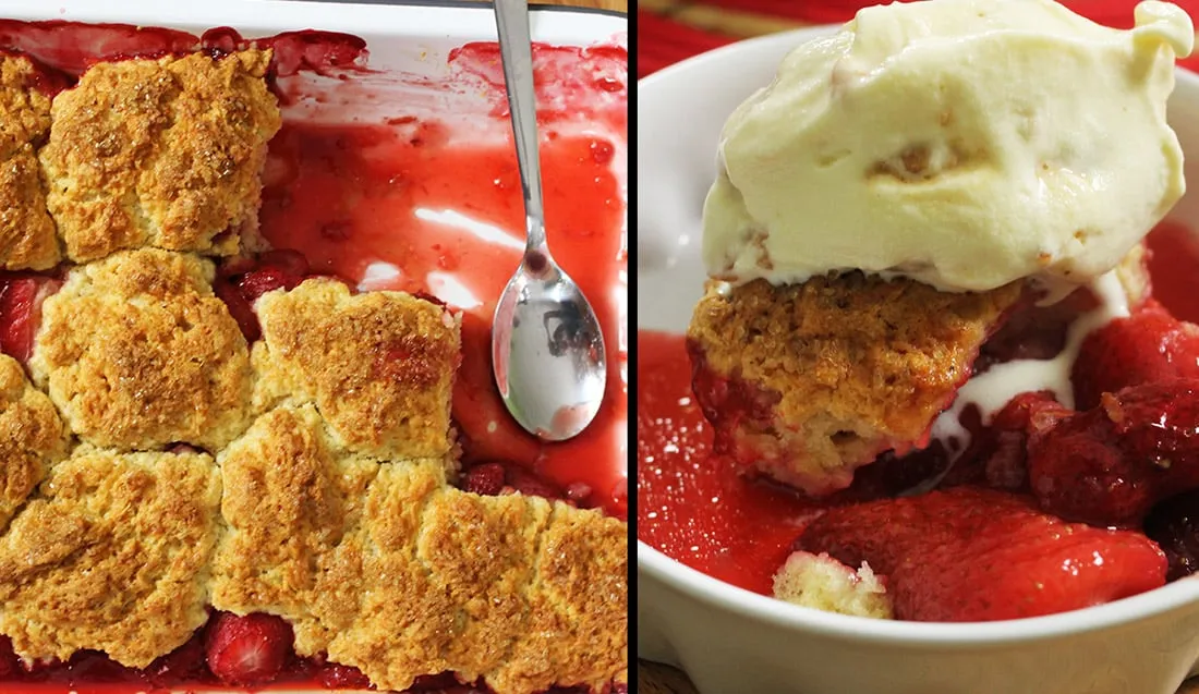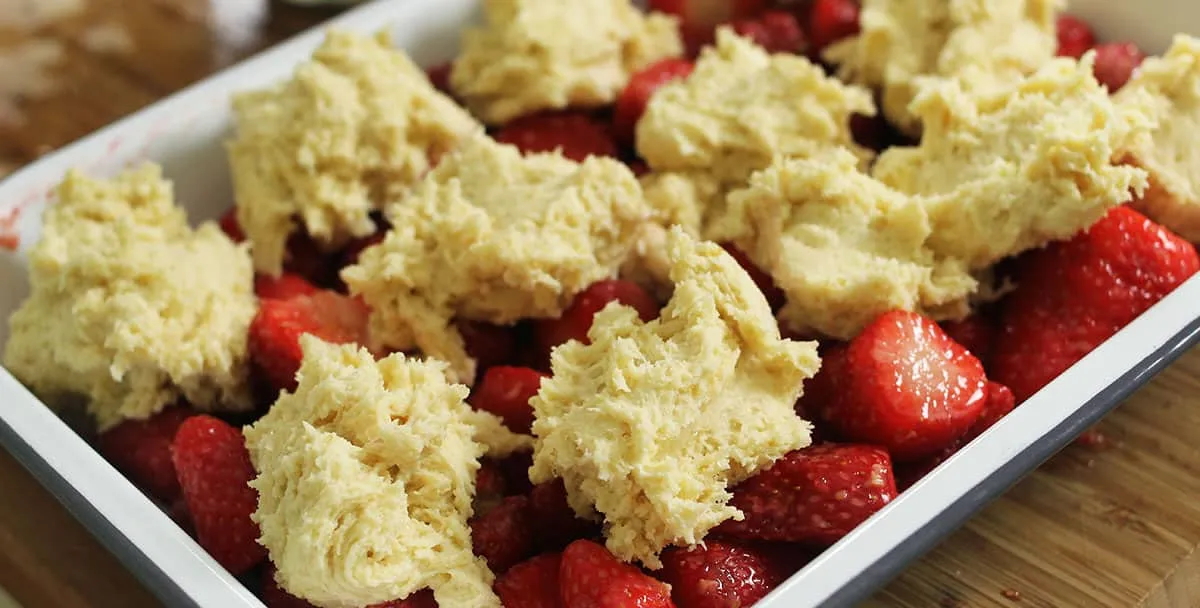 Összekeverjük a lisztet, cukrot, sütőport és a sót, hozzáadjuk a hideg vajkockákat és robotgéppel egyenletesre keverjük. Beletesszük a tejszínnel kikevert tojást és épp csak addig keverjük, amíg a tészta összeáll. A tésztát kanállal a gyümölcsre szaggatjuk (mint az aranygaluskát) és megszórjuk kristálycukorral.