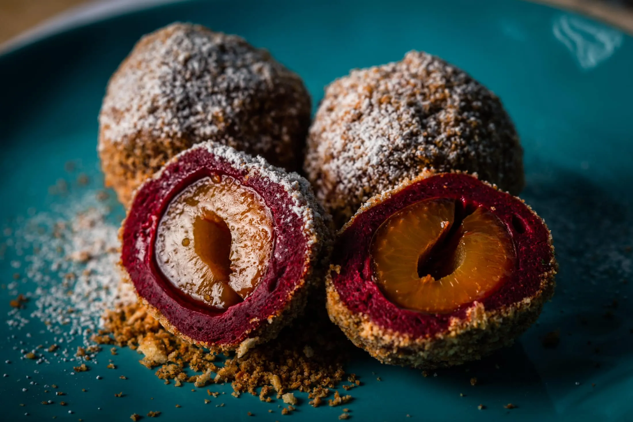 A szilvákat középen félig bevágjuk, kimagozzuk, a mag helyére pedig szórunk a fahéjjal elkevert cukorból.