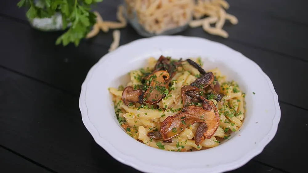 A szárított gombát langyos vízbe áztatjuk és 20 percre félretesszük, amíg megszívja magát.A hagymát és a fokhagymát finomra vágjuk. Az olajat serpenyőben felhevítjük és puhára pároljuk rajta őket. A camembert sajtot apró kockákra vágjuk és a hagymához adjuk. Felolvasztjuk és felöntjük fehérborral. Beledobjuk a kakukkfüvet és felöntjük tejszínnel, addig rotyogtatjuk, amíg szép sima mártást nem kapunk. Sózzuk, borsozzuk és őrölt szerecsendióval ízesítjük.A petrezselymet finomra aprítjuk, a citrom reszelt héjával összekeverjük, majd a finomra aprított dióval is összeforgatjuk. Közben kifőzzük a tésztát.Egy másik serpenyőben olajat hevítünk. A beáztatott gombákat kicsit kinyomkodjuk és a forró olajon lepirítjuk. A gombák áztató levét nem öntjük ki, hanem néhány evőkanálnyiít a camembert-es mártáshoz adunk belőle és újra összeforraljuk. Beleforgatjuk a kifőtt tésztát és tálaljuk: a tésztát tányérra szedjük, teszünk rá a pirított vargányából és a gremolatából. A végén meglocsoljuk kevés olívaolajjal.