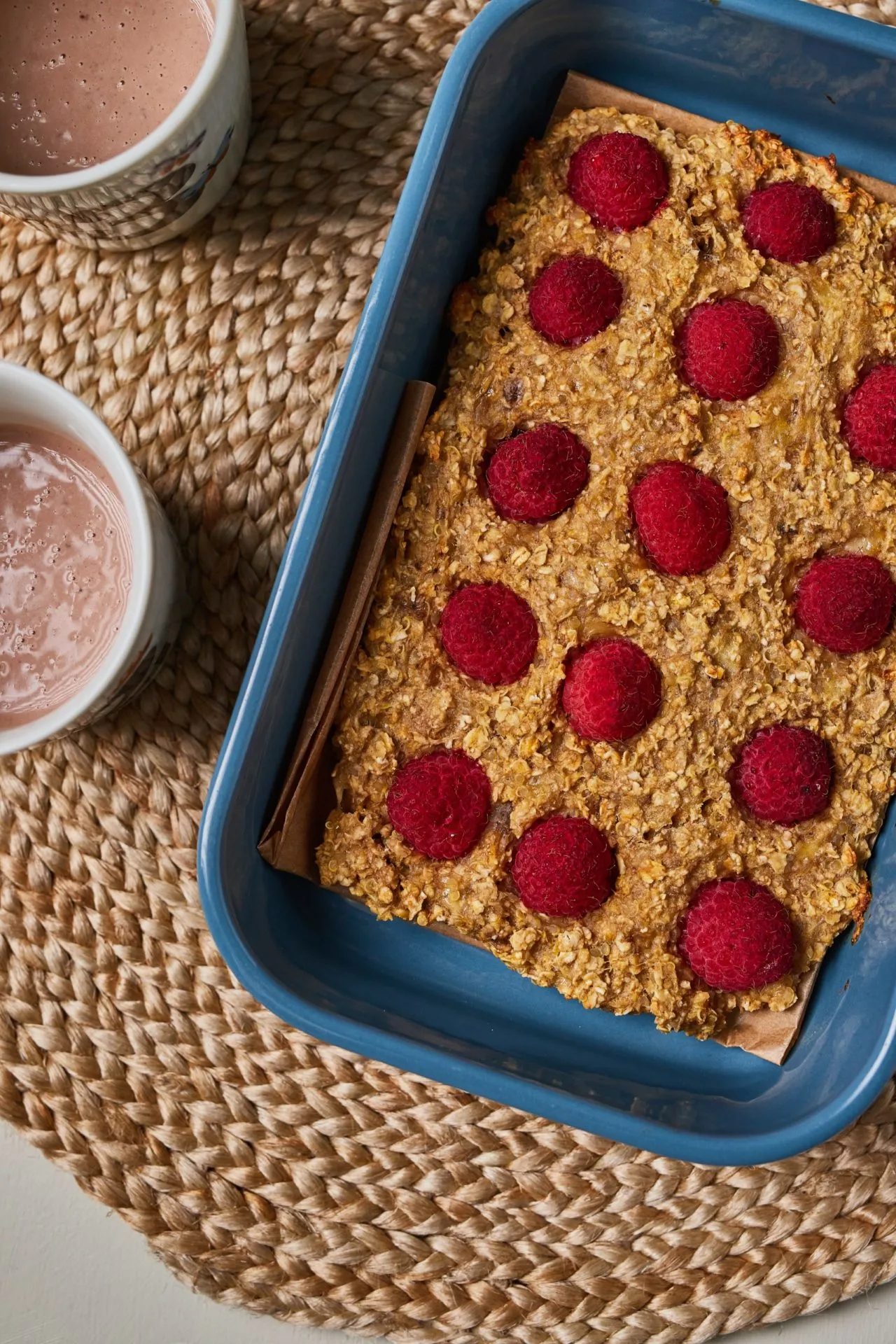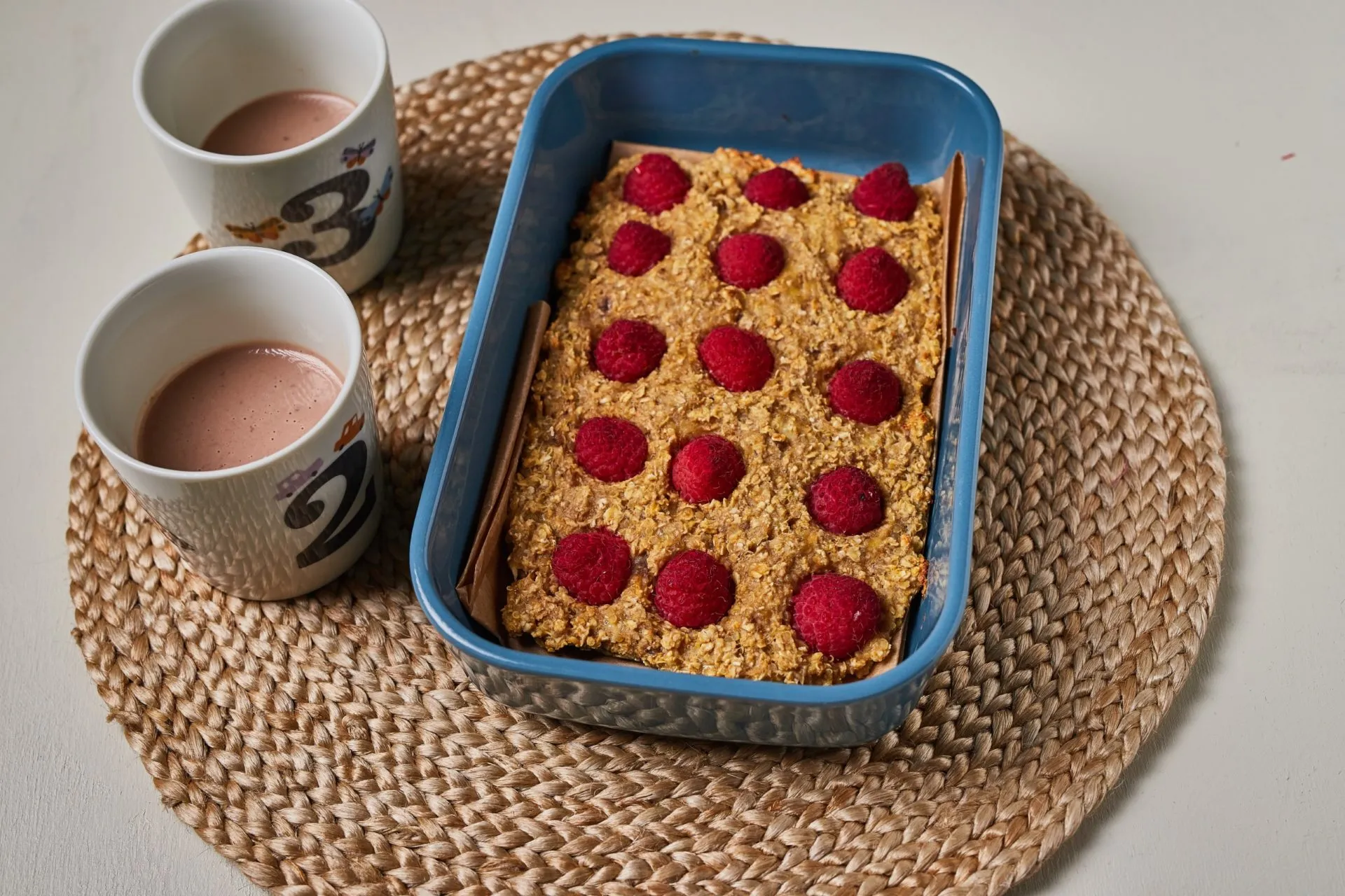 A masszát egy kb. 10 cm x 10 cm-es, sütőpapírral bélelt tepsibe öntjük, ízlés szerint friss gyümölcsöket szórunk a tetejére, majd 180 fokra előmelegített sütőben 25 percig sütjük.