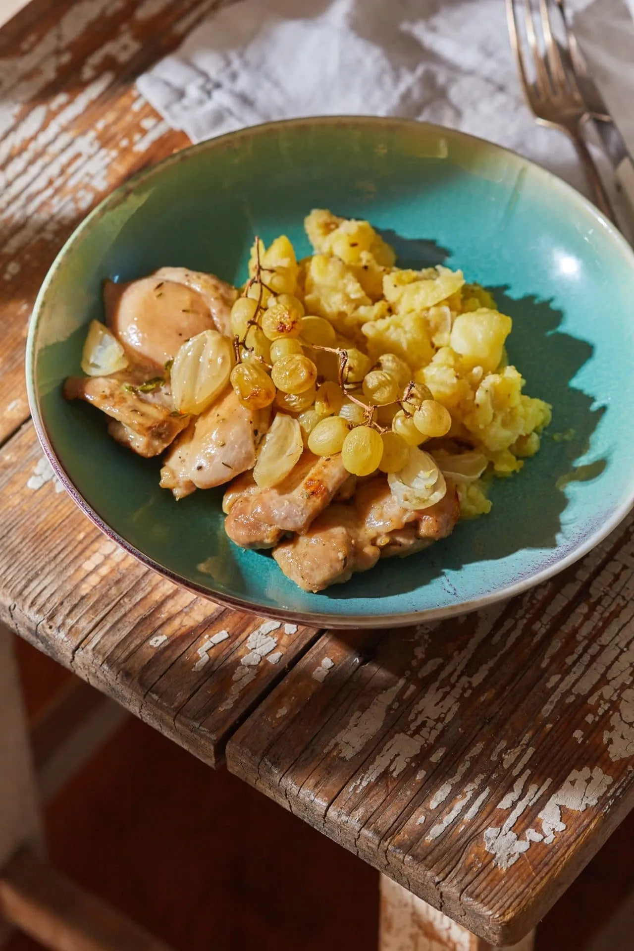 A csirkecombokat sózzuk, borsozzuk, majd egy felforrósított serpenyőben az olajon mindkét oldalukat és a negyedelt hagymákat is megpirítjuk. Ezután felöntjük a fehérborral, az alaplével, és az egészet a felére forraljuk. Ráreszelünk egy kis szerecsendiót, beledobjuk a kakukkfüvet, a fokhagymát és beletesszük a szőlőt, majd az egészet 170 fokra előmelegített sütőbe toljuk 20 percre. Mikor a szőlő kicsit megtöppedt, kiveszünk mindent egy tányérra.