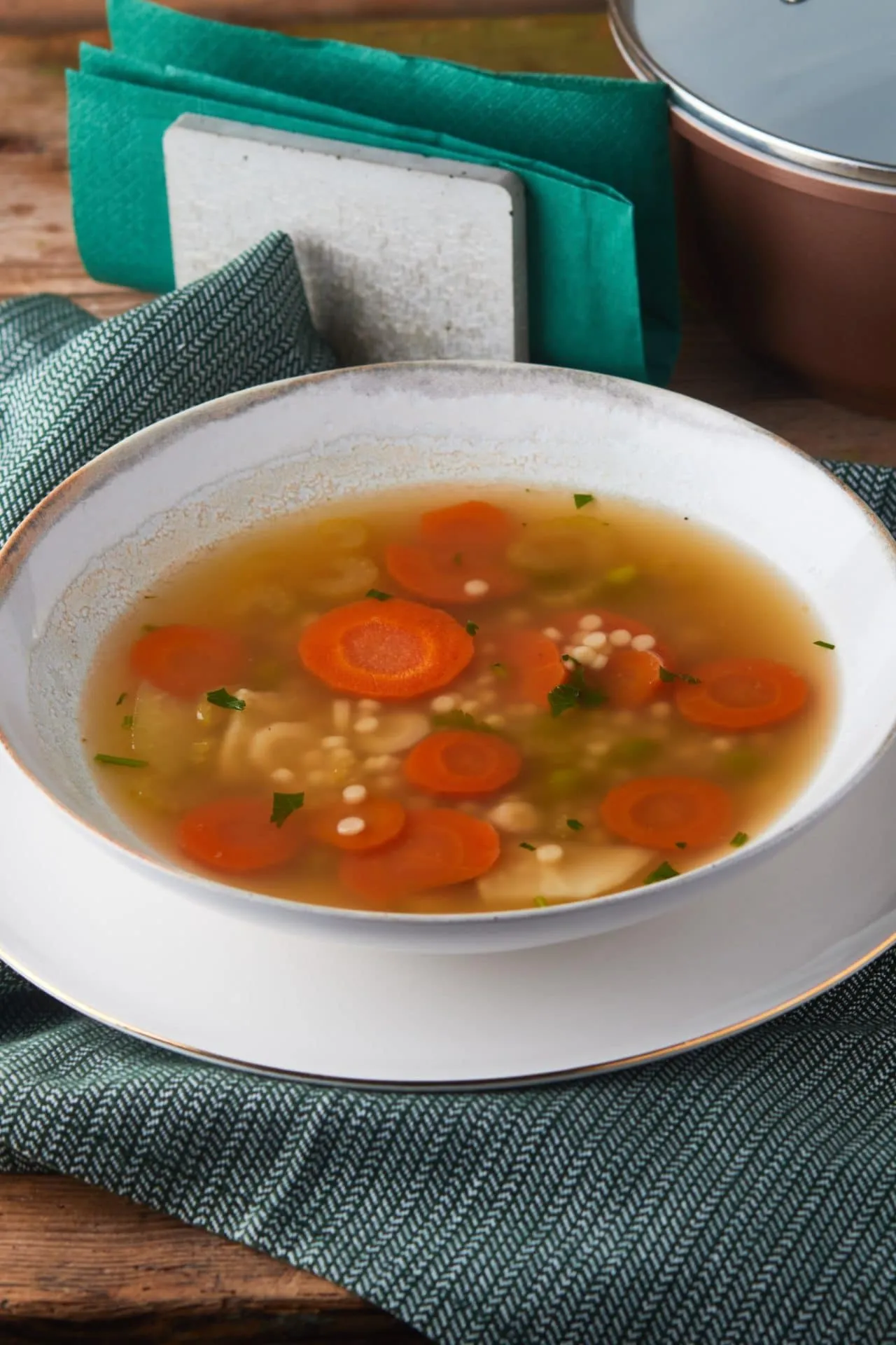 Ha kész, leszűrjük, belerakjuk a levesbetét hozzávalóit, a borsó kivételével, 10 perc főzés után mehet bele a borsó is, majd szintén 10 perc után elzárjuk. Friss petrezselyemmel megszórva tálaljuk.