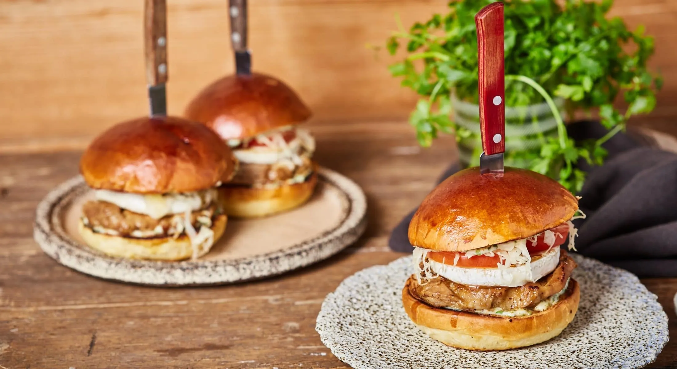 Egy tiszta serpenyőben olajat hevítünk, és a sajtok mindkét oldalát 1-2 perc alatt megsütjük. A húsos serpenyőt visszatesszük a főzőlapra, és az elfelezett bucik belsejét 1 perc alatt megpirítjuk. A zsemle alját megkenjük a majonézzel, ráteszünk egy szelet húst, a sajtot, a paradicsomot, a savanyú káposztát és végül a buci tetejét, amit szintén megkenünk a majonézzel.