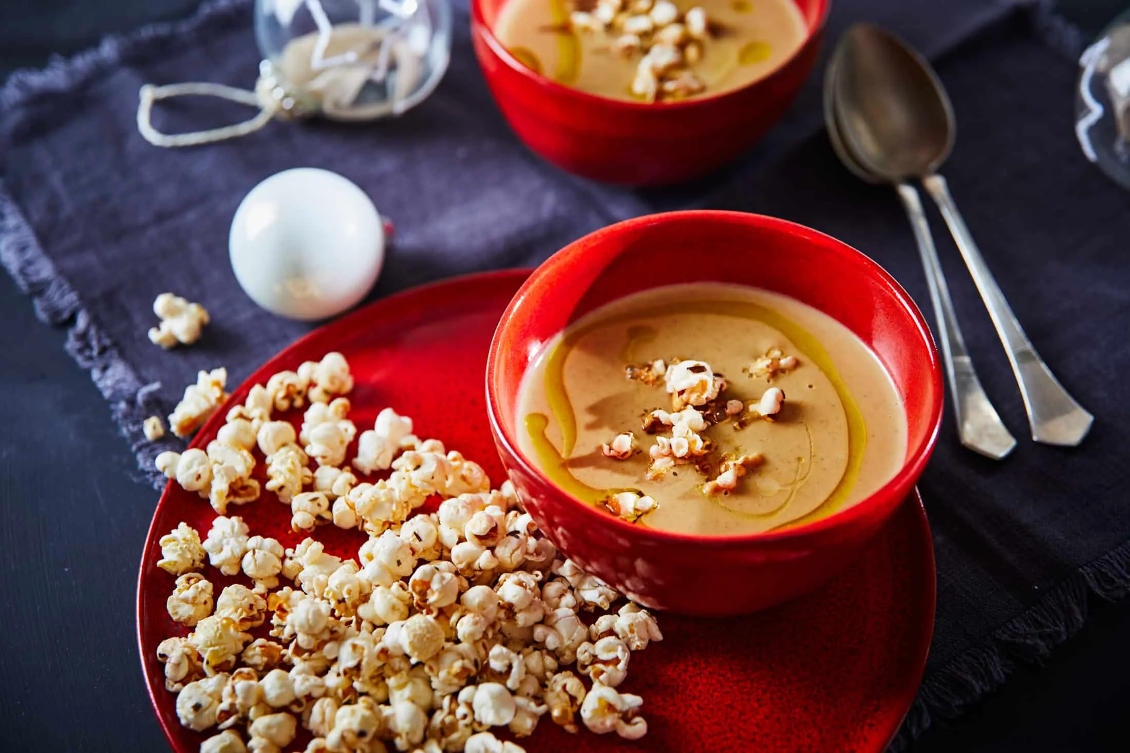 A levesre kevés olívaolajat csorgatunk, és a pattogatott kukoricával tálaljuk.