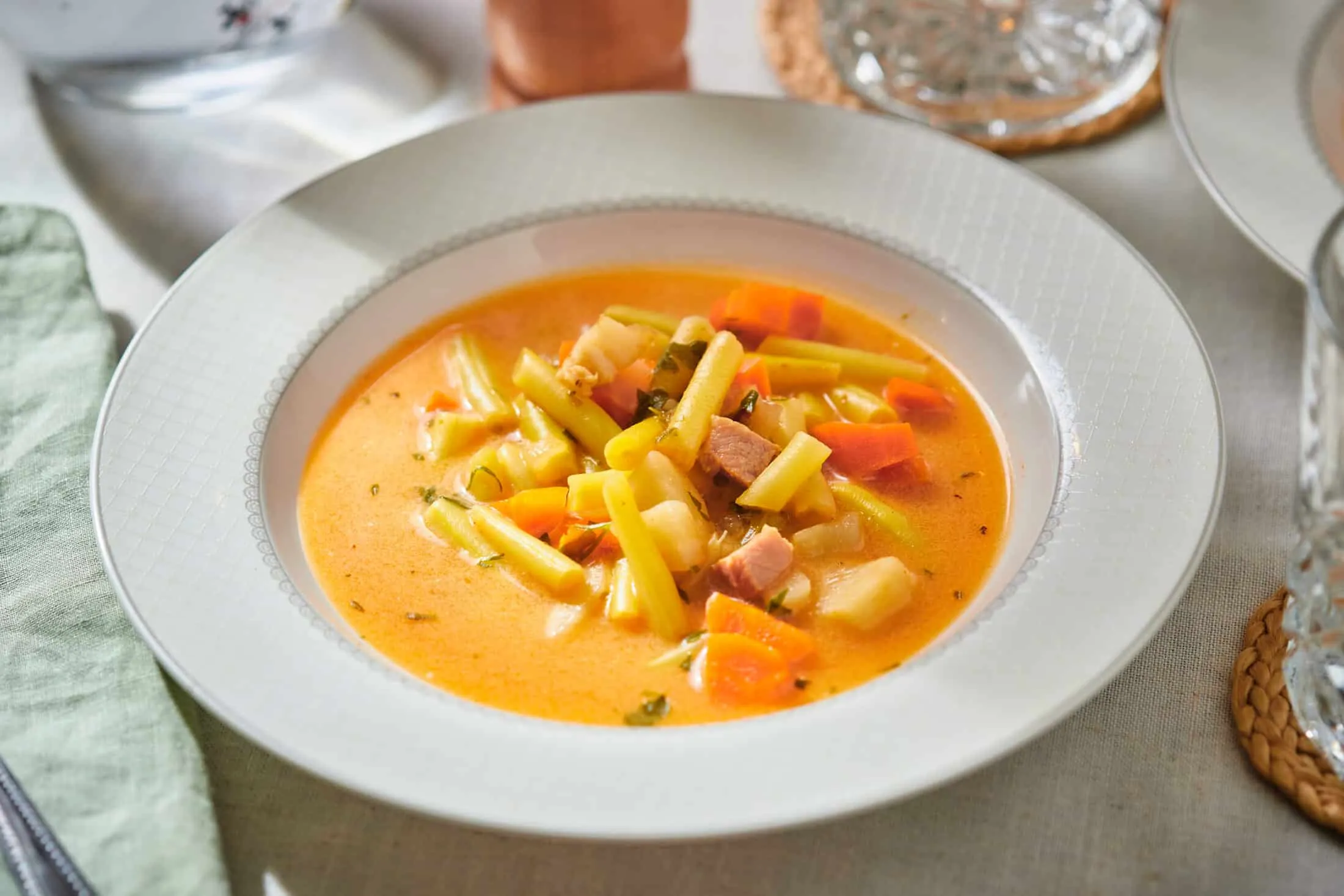 A tárkonyos zöldbableves első lépése, hogy a gyökérzöldségeket megpucoljuk és kis kockákra vágjuk. A sonkát apróra vágjuk, és egy lábosban elkezdjük pirítani az olajon. Ha nagyjából lepirult, rádobjuk az apróra vágott hagymát és a zúzott fokhagymát. Sózzuk, borsozzuk, rászórjuk a paprikát és a tárkonyt, és a bab kivételével belekeverjük a zöldségeket.