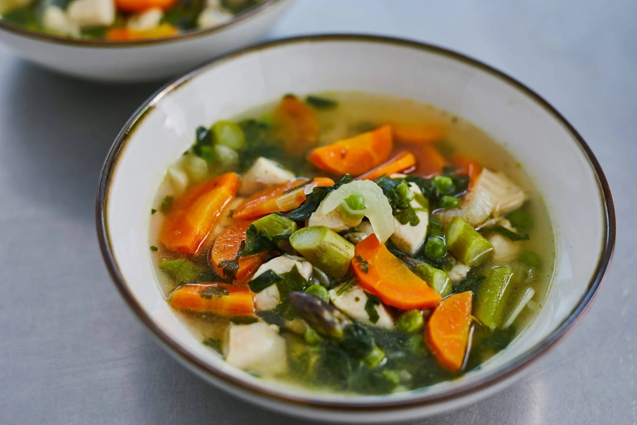 Az olívaolajon magas hőmérsékleten megpirítjuk a felkockázott, sózott, borsozott csirkemellet, majd kiszedjük. Ugyanabban az edényben üvegesre pároljuk az apróra vágott hagymát és fokhagymát, sózzuk, borsozzuk, majd rárakjuk a kis darabokra vágott répát és zellert, felöntjük az alaplével, felforraljuk, és 10 percig rotyogtatjuk. Közben a spárga fás részét levágjuk, a többi részt kis darabokra vágjuk, a zsenge végeit pedig félrerakjuk, mert az csak a végén kerül bele. Beletesszük a levesbe a borsóval együtt, és további 10 percig főzzük. Mielőtt elzárnánk, mehetnek bele a felaprított zöld fűszerek és a félretett spárga. Belefacsarjuk a citromlevet, és kész is.