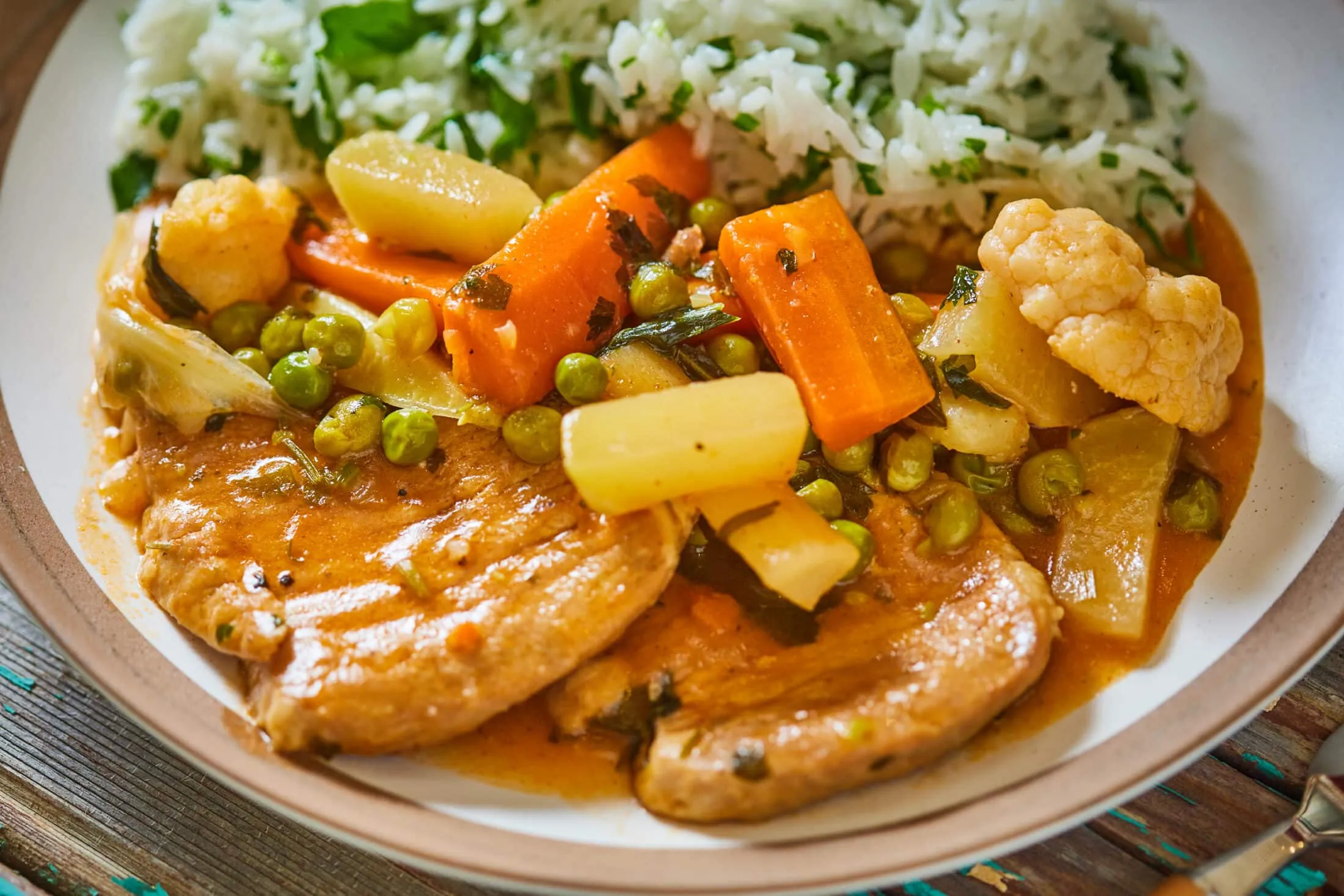 Ezt követően a zöldségeket a fentebb leírt sorrendben a raguhoz adjuk. A karalábét, répát és petrezselyemgyökeret hasonló, 2 x 5 cm-es hasábokra vágjuk, a karfiolt rózsáira szedjük. Utoljára a vágott petrezselyem szára, a karalábé zöldje, illetve a karfiol kerüljön bele. Mikor a hús és a zöldségek is kellően megpuhultak, párolt rizzsel tálaljuk.