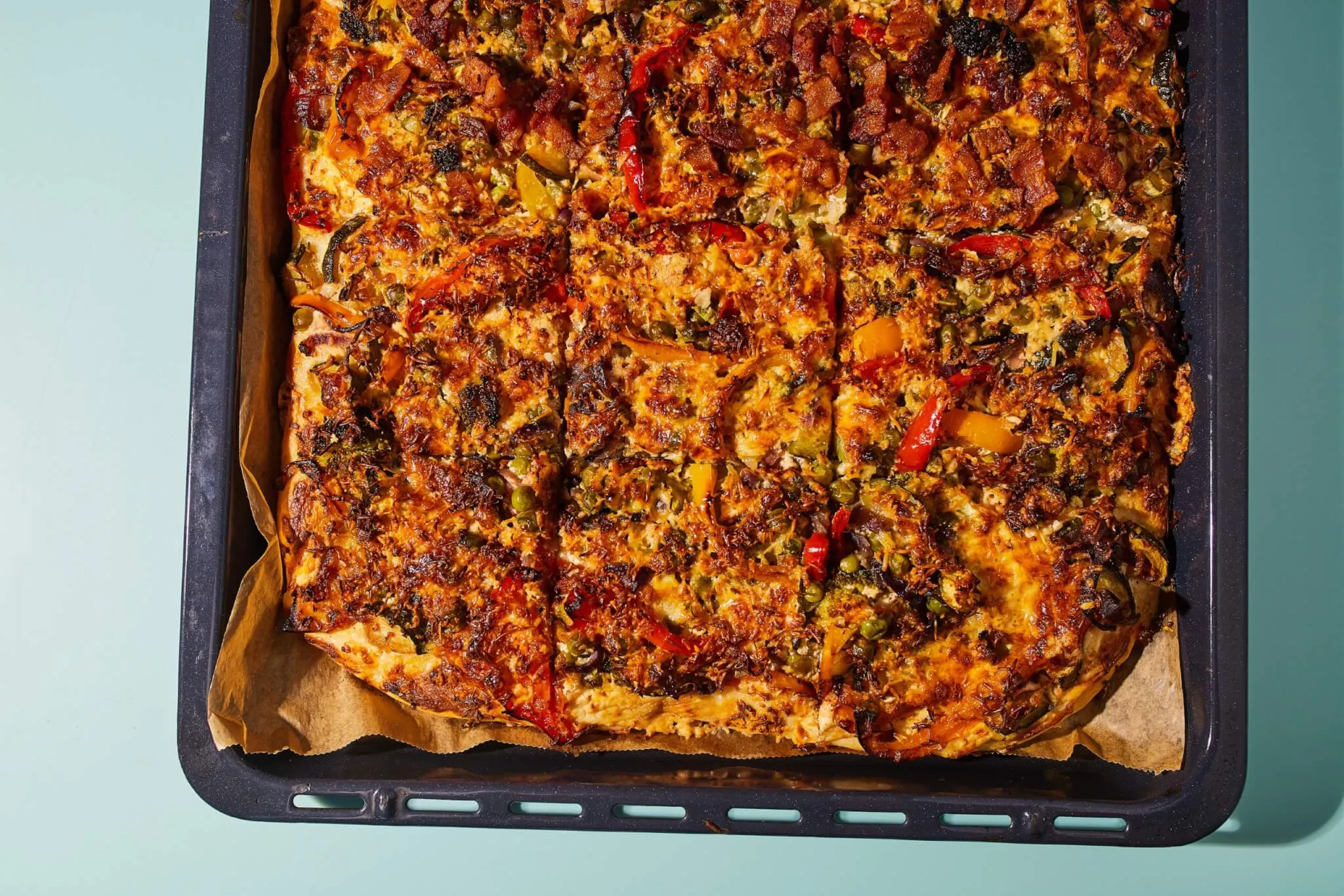 A tejfölt kikeverjük a többi hozzávalóval, és lekenjük vele a tésztát, ráhalmozzuk a zöldségeket (ha engedett egy kis levet, azt öntsük le róla), ráreszeljük a sajtokat, és a felét megszórjuk a baconös keverékkel, majd 200 fokos, előmelegített sütőben 35-40 perc alatt megsütjük.