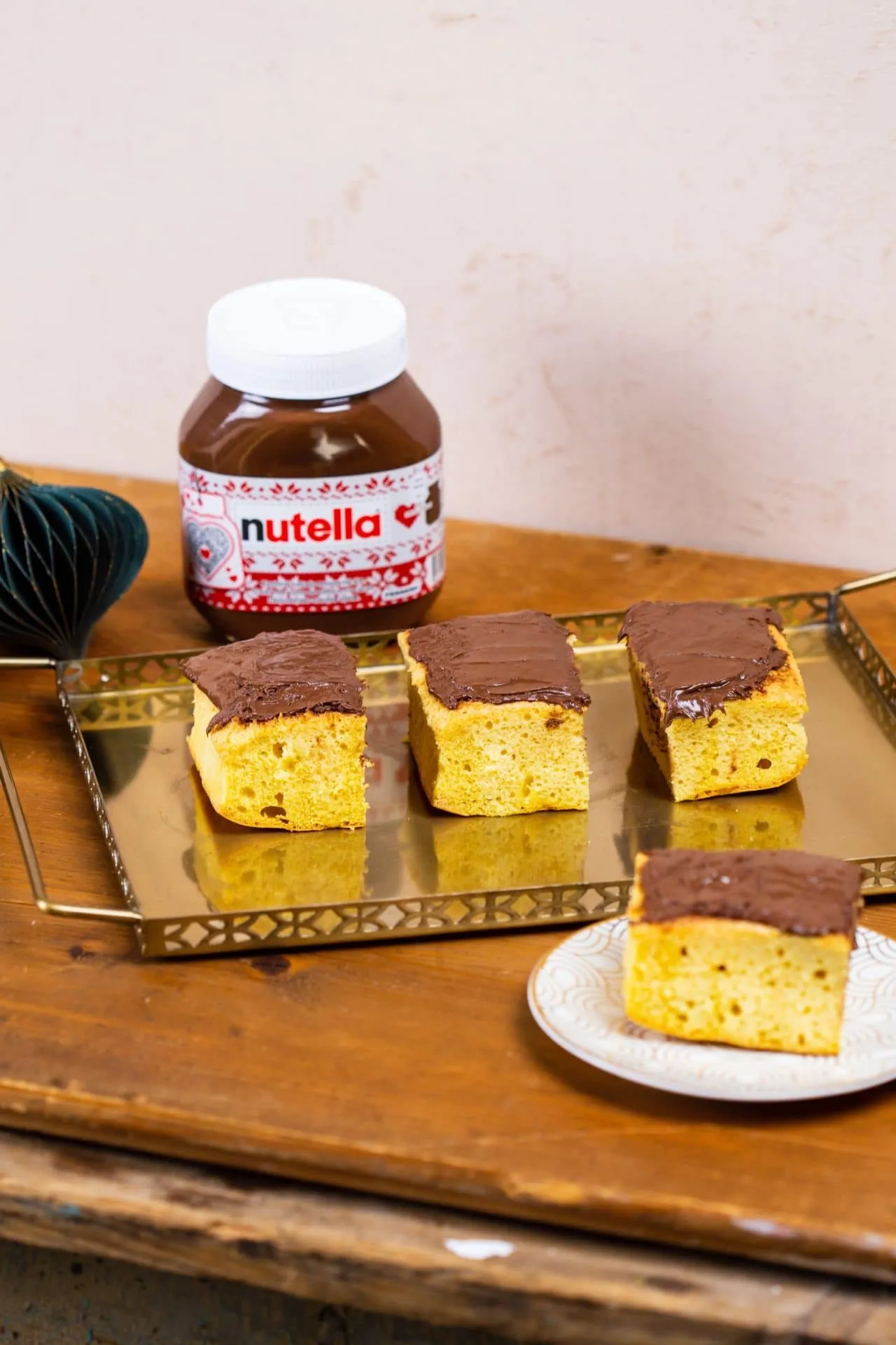 A tejes keverék hozzávalóit összekeverjük egy tálban, és leöntjük vele a piskótát. Ezután megkenjük a tetejét NUTELLA®-val, és tálalhatjuk is.