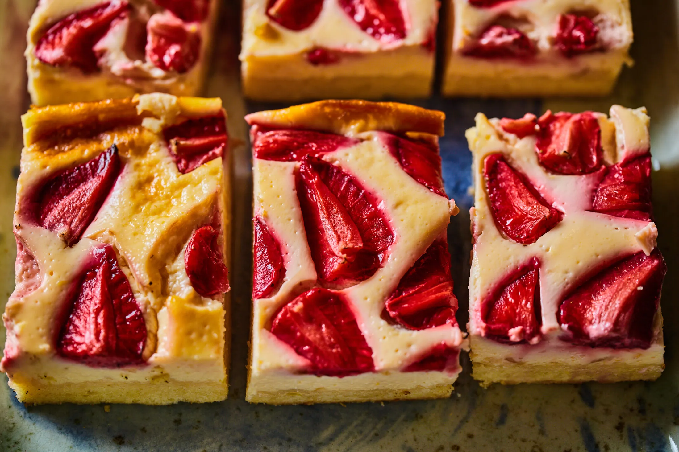 A forma aljába sütőpapírt helyezünk, és a pihentetett tésztát lisztezett felületen kinyújtjuk akkorára, mint a forma, majd belehelyezzük, villával megszurkáljuk pár helyen és 170 fokra előmelegített sütőben 10 perc alatt elősütjük. Ha megvan, megszórjuk a tészta tetejét zsemlemorzsával, beleöntjük a tejfölös masszát, és a tetejét kirakjuk a negyedelt eprekkel. Végül visszatesszük a sütőbe további 40 percre. Kihűtjük, és már szeletelhetjük is a sütikét.