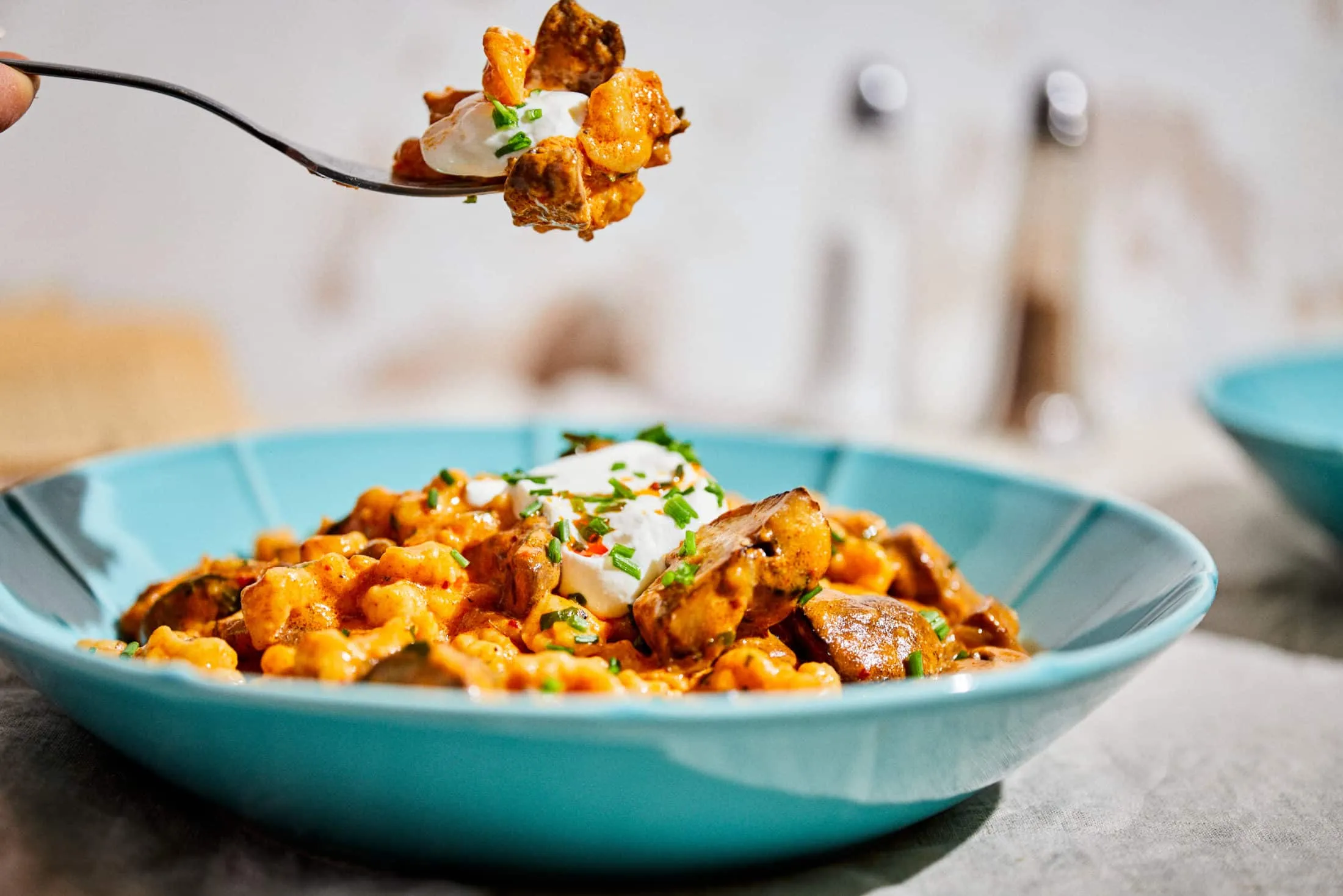 A nokedlihez a tojást, a sót és a hideg vizet összekeverjük, majd a liszthez adjuk. Gyorsan összedolgozzuk, és lobogó, sós vízbe szaggatjuk. A megfőtt nokedlit rászedjük a tejfölös gombára, és jól elkeverjük. Tálaláskor tejfölt kanalazunk rá, és megszórjuk apróra vágott petrezselyemzölddel.