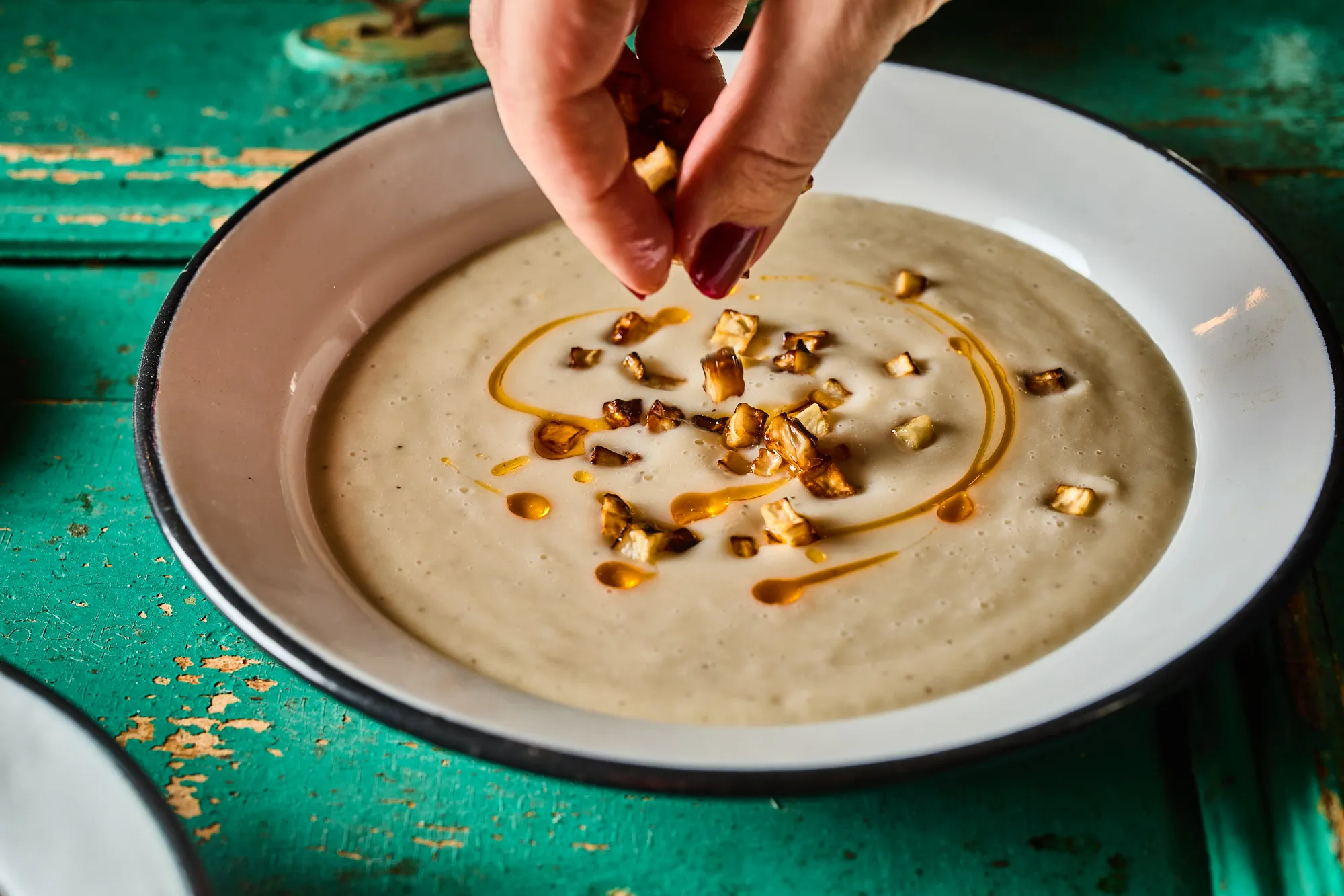 A zeller ízét lágyíthatjuk egy kevés krumpli vagy sárgarépa hozzáadásával. Tejföl helyett tejszínnel is készíthetjük, ha gazdagabb, krémesebb állagot szeretnénk. A tányért friss petrezselyemmel vagy snidlinggel díszíthetjük, hogy még ünnepibb legyen. A chiliolajat fokozatosan adagoljuk, ízlésünknek megfelelő mennyiségben.
