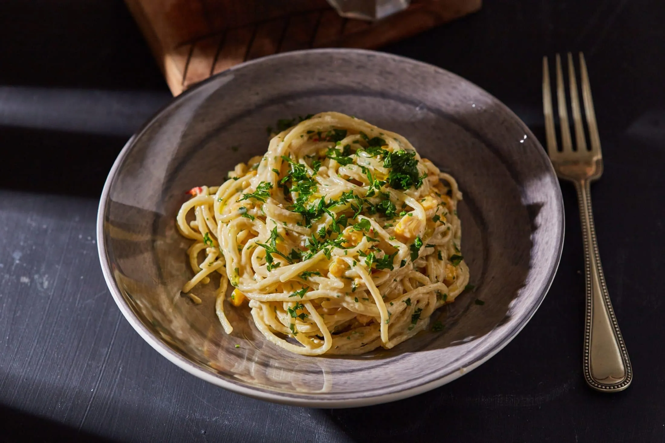 A tésztát bő, lobogó, sós vízben 8-10 perc alatt kifőzzük. A hagymát, fokhagymát apró kockákra vágjuk, és elkezdjük lepirítani az olajon. Ha üveges a hagyma, mehet hozzá a konzerv kukorica és a chilipehely. Picit lepirítjuk a kukoricát is, majd felöntjük a tejszínnel. Sózzuk, borsozzuk, és sűrűre forraljuk a szószt. A végén dobunk bele egy kanál vajat, és megszórjuk aprított petrezselyemmel. A leszűrt tésztát belekeverjük a raguba, és már ehetjük is.
