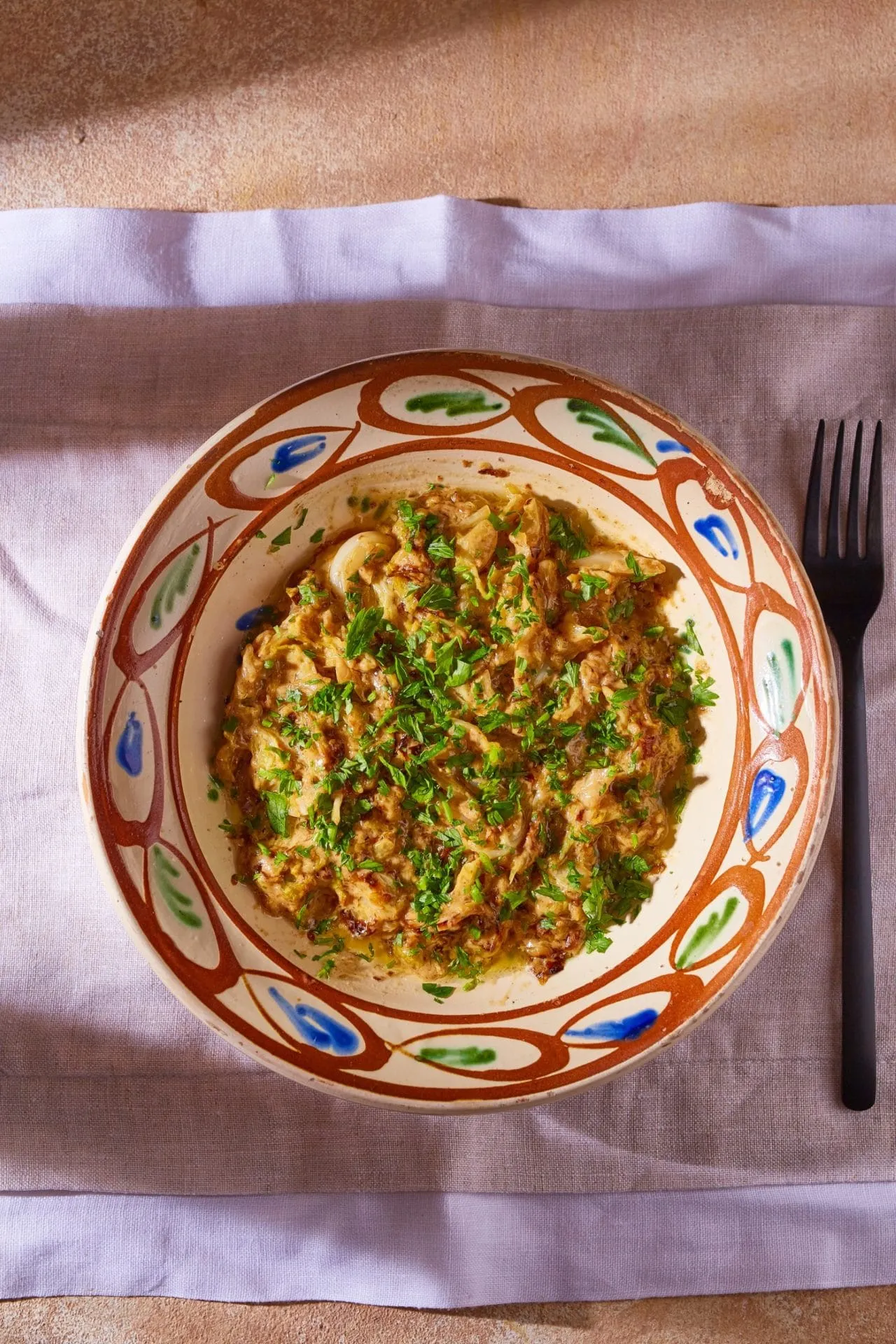 A káposztát felcsíkozzuk, majd száraz serpenyőben kicsit „megégetjük”. Amikor kapott egy kis színt, hozzátesszük az apró kockákra vágott hagymát, öntünk rá 2-3 evőkanál olajat, és tovább pirítjuk. Felöntjük a tejszínnel, sózzuk, borsozzuk, és körülbelül 2-3 percig rotyogtatjuk. Amikor elkészült, belefacsarjuk a citromot, és friss petrezselyemmel tálaljuk.
