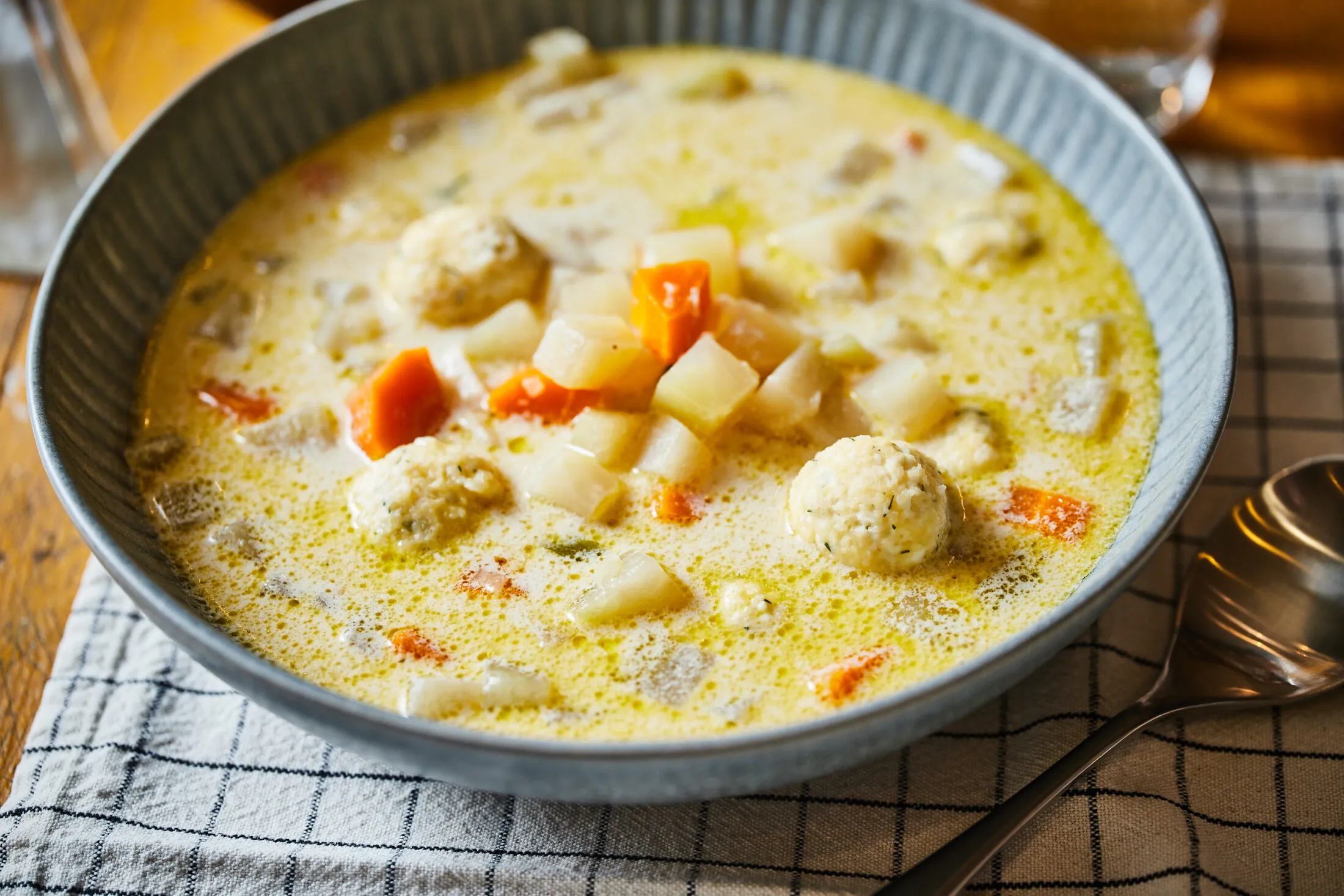 Amikor a zöldségek megpuhultak a levesben, beleöntjük a tejszínt, egyet forralunk rajta, majd lekapcsoljuk a tűzhelyet. Belefacsarjuk a citrom levét, és a kész levest a gombócokkal tálaljuk.