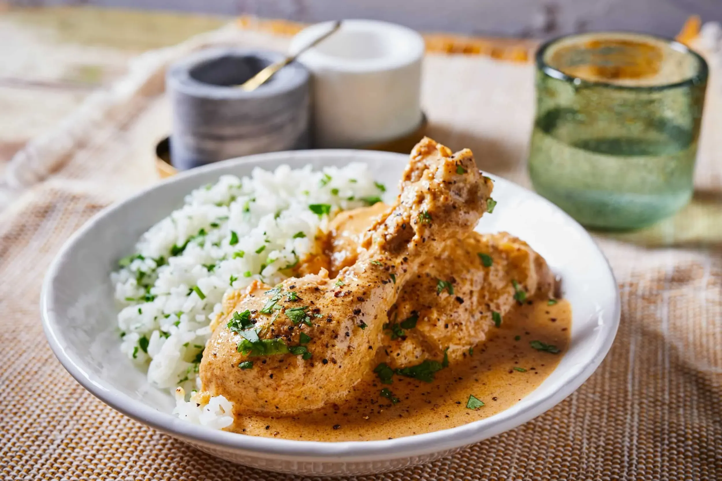 Ha majdnem omlós a hús, kiszedjük, majd az alapot az edényben botmixerrel pépesítjük. Hozzáöntjük a tejszínt, és kb. egy csapott evőkanál liszttel és 100 ml vízzel készített habarással besűrítjük, majd kiforraljuk. A combokat visszatesszük, és lassú fokozaton összeforraljuk. Ideális köret hozzá a párolt rizs vagy a főtt tészta.