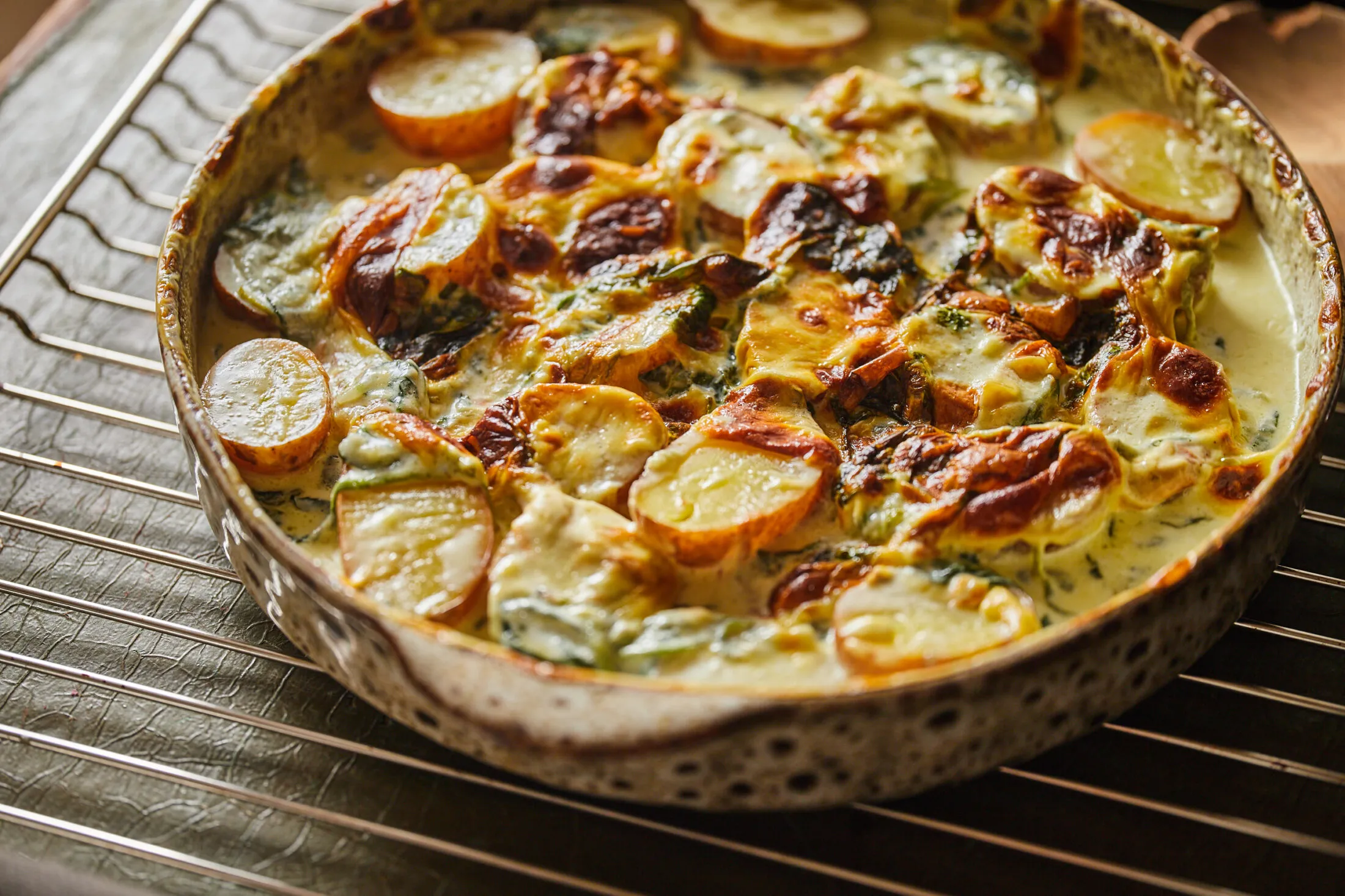 A tejszínes-spenótos krumpli elkészítésének első lépéseként a krumplikat megmossuk, héjastól félbevágjuk és megsózzuk. A tejszínben elkeverjük a vízzel kikevert keményítőt és a zúzott fokhagymát, majd a sütőtálba öntjük. Én egy kb. 28 cm átmérőjű kerek formát választottam, de ettől el lehet térni. A tejszínes keverékbe beletesszük a spenótleveleket úgy, hogy azokat minél inkább ellepje a tejszín, és sózzuk, borsozzuk. Beleültetjük a krumplikat a vágási (Feri 😀) felülettel felfelé, betesszük a 200 fokra előmelegített sütőbe kb. 30 percre és készre sütjük. Köretként vagy önmagában is kiváló.