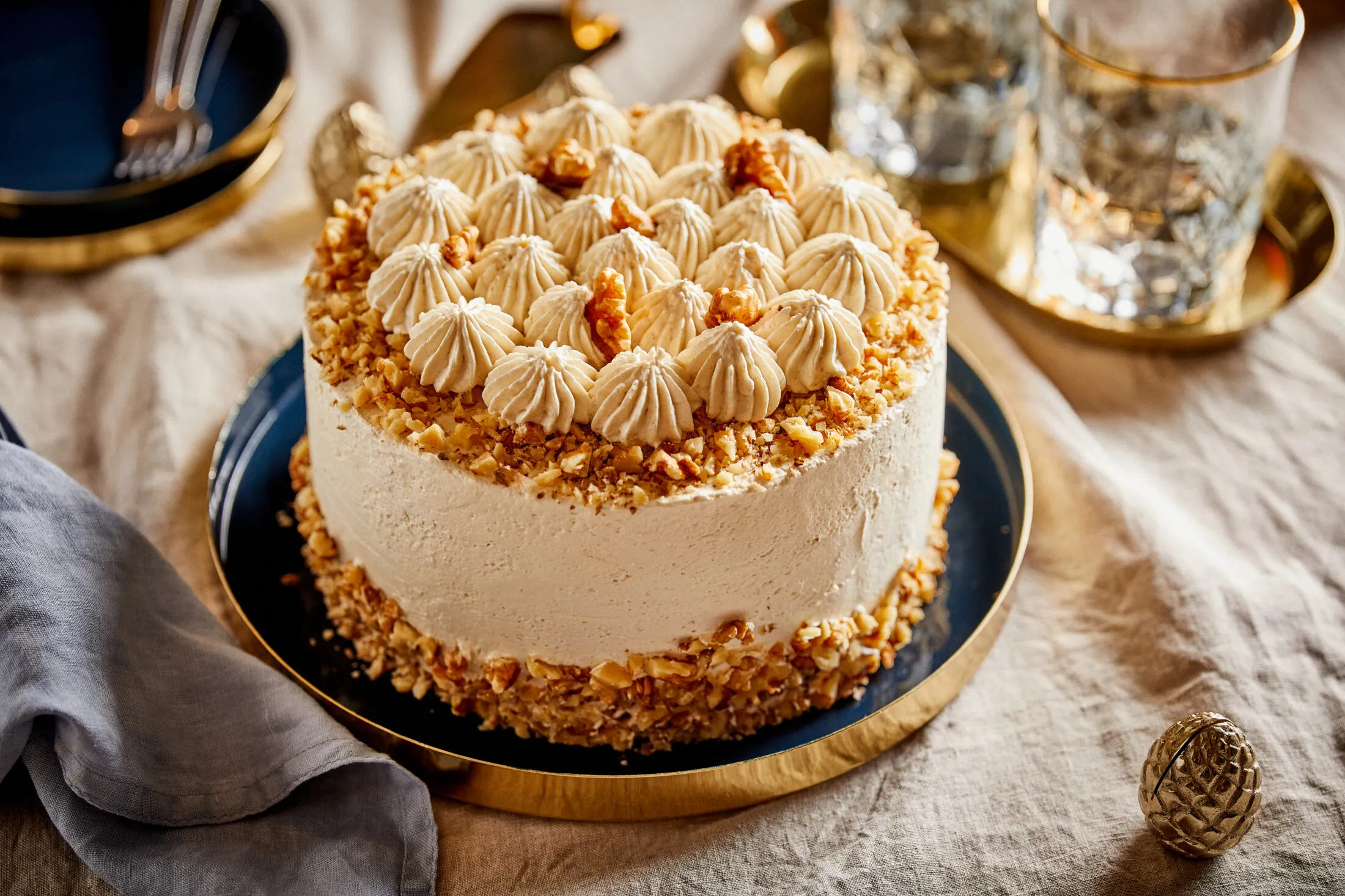 A tortát körbekenjük egy réteg vajkrémmel, majd mehet 30 percre a hűtőbe/fagyasztóba. Jöhet egy második réteg vajkrém, majd a maradékot csillagcsöves habzsákba rakjuk. Végül apróra vágott dióval és a maradék vajkrémmel díszítjük a tortát.