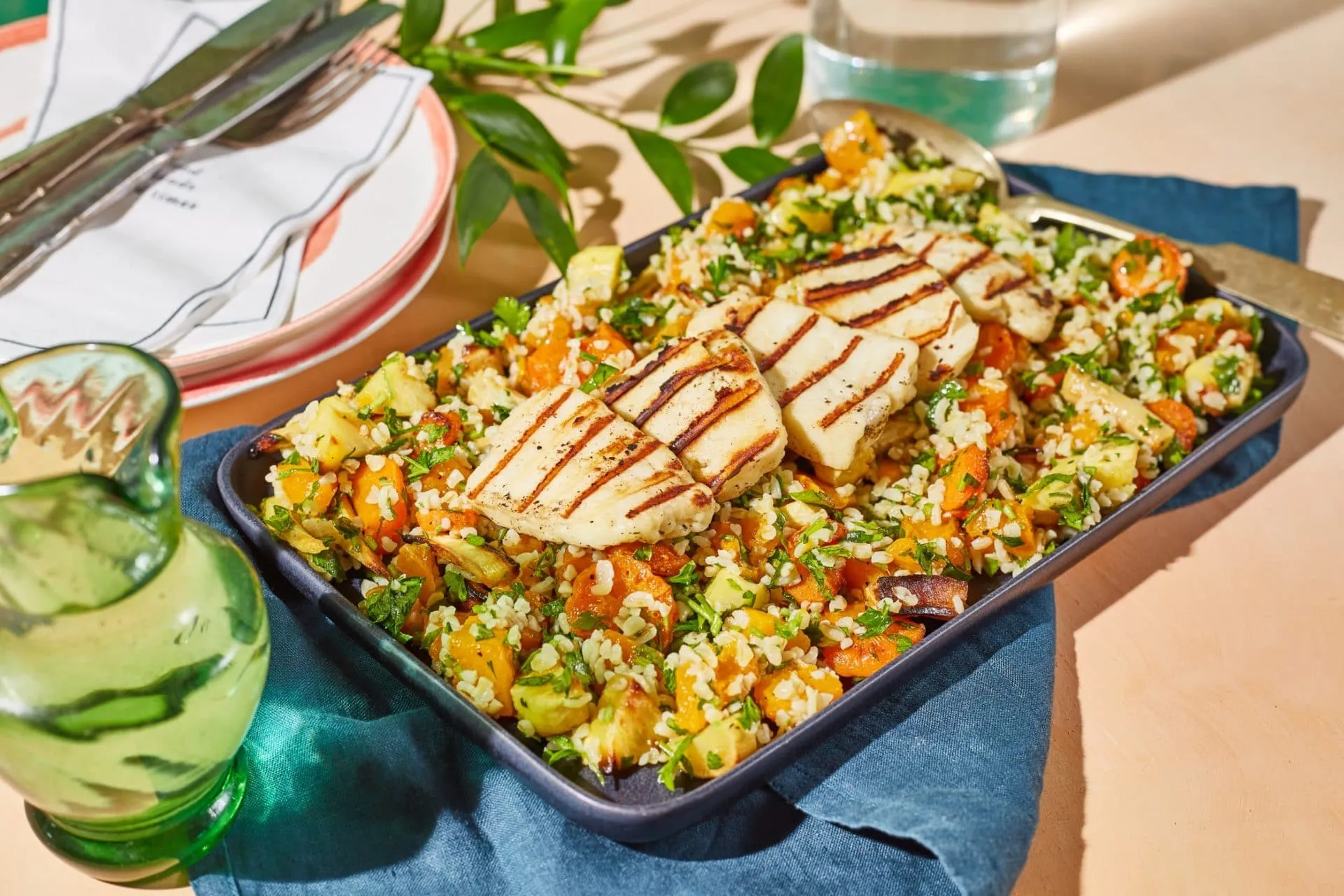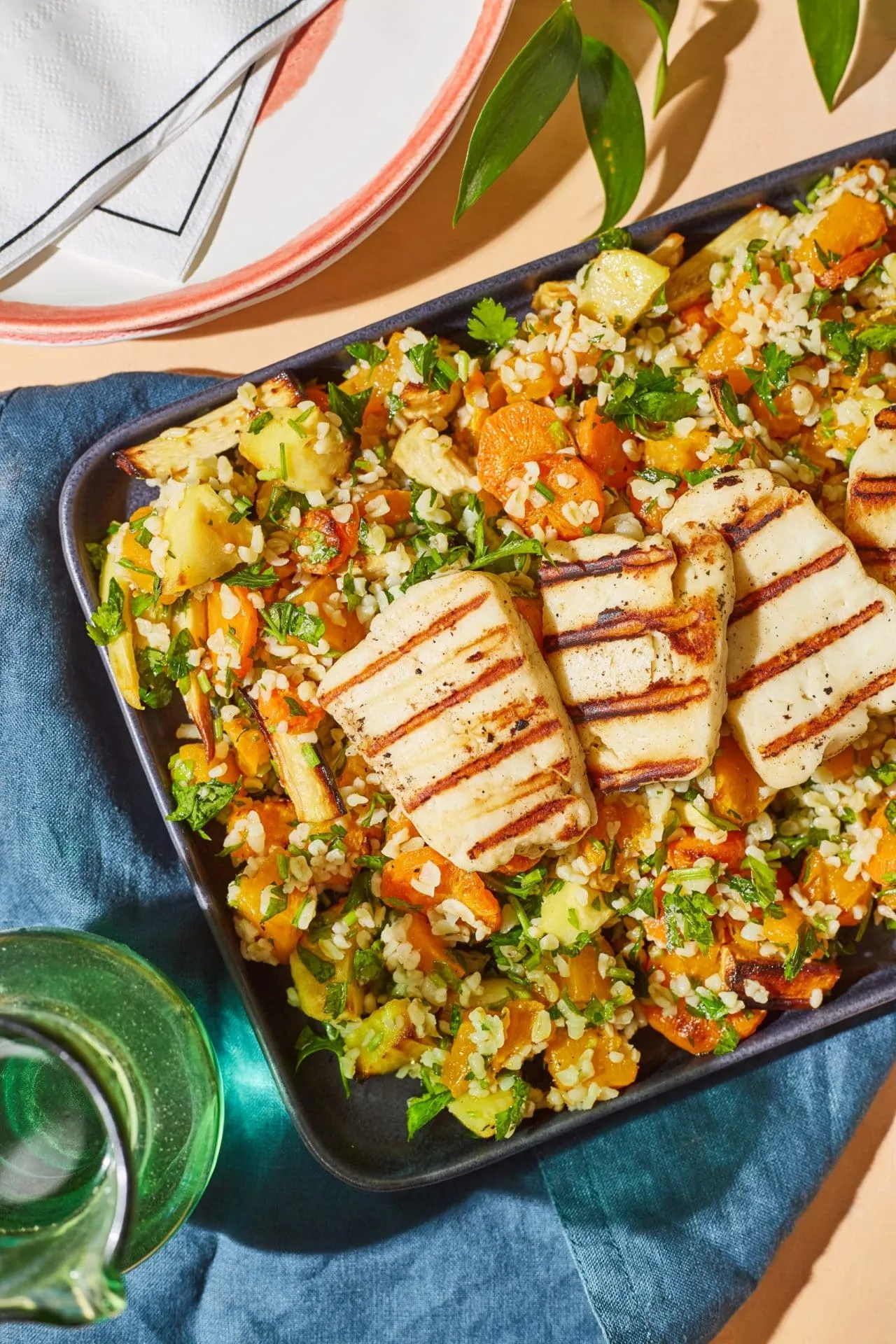 A halloumit szeletekre vágjuk, és egy grillserpenyőben megpirítjuk. A salival tálaljuk.