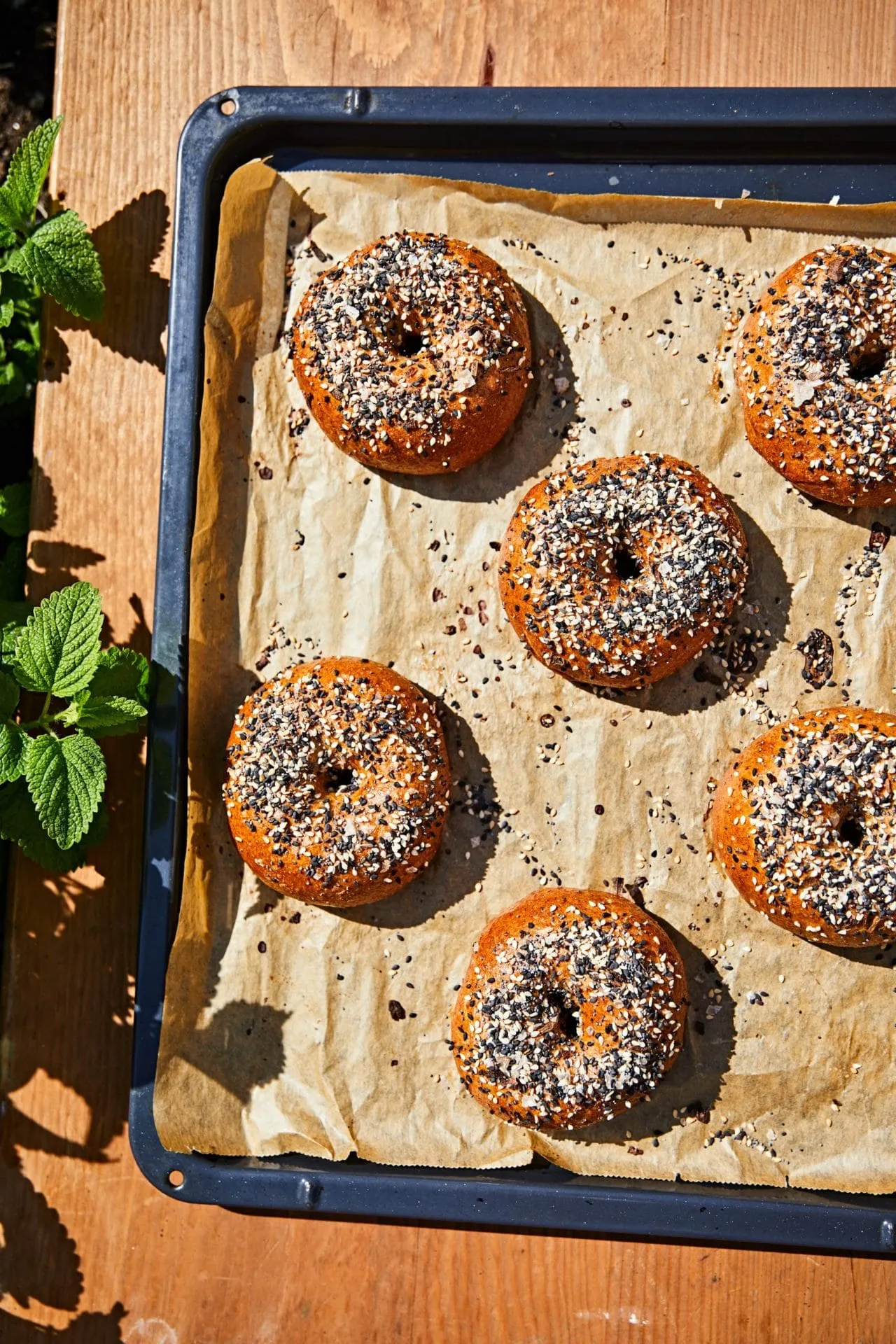 Enyhén lobogó vízbe rakjuk a mézet és a szódabikarbónát, és mehet bele a tészta is. Figyeljünk, mert meg fognak nőni, így ha nem elég nagy az edényünk, csak egyesével főzzük, oldalanként 1-1 percig. Ezután egy tepsire tesszük, és lekenjük a tojással. A fűszerkeverék hozzávalóit összekeverjük, és megszórjuk vele a bagelek tetejét. 190 fokra előmelegített sütőben 20-25 perc alatt megsütjük.