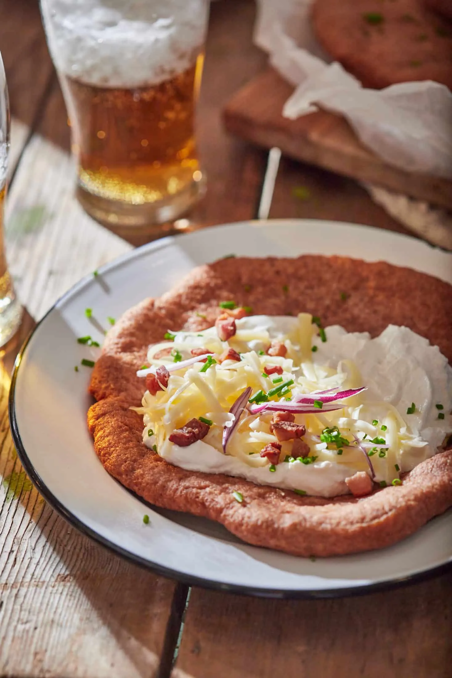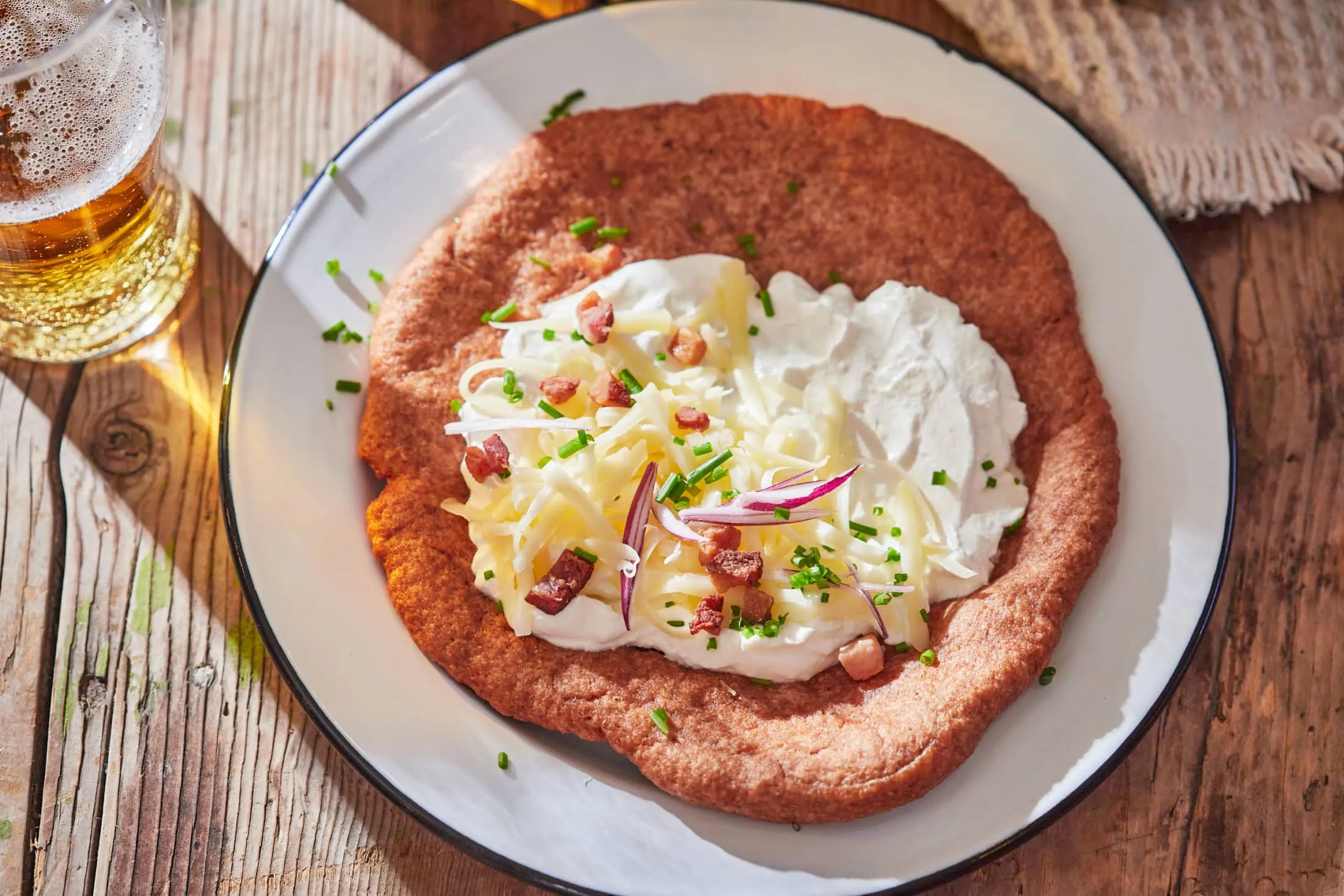 A tésztát ezután egyenlő darabokra osztjuk, gömb alakúvá formázzuk, majd kézzel lángos nagyságúra nyújtjuk. Fontos, hogy olajos kézzel nyújtsuk ki a tésztát, mert így nem fog a kezünkhöz ragadni. A lángosokat forró olajban, oldalanként 2-3 percig sütjük, míg aranybarna nem lesz, majd lecsepegtetjük. Tetszés szerint különböző feltétekkel fogyaszthatjuk.