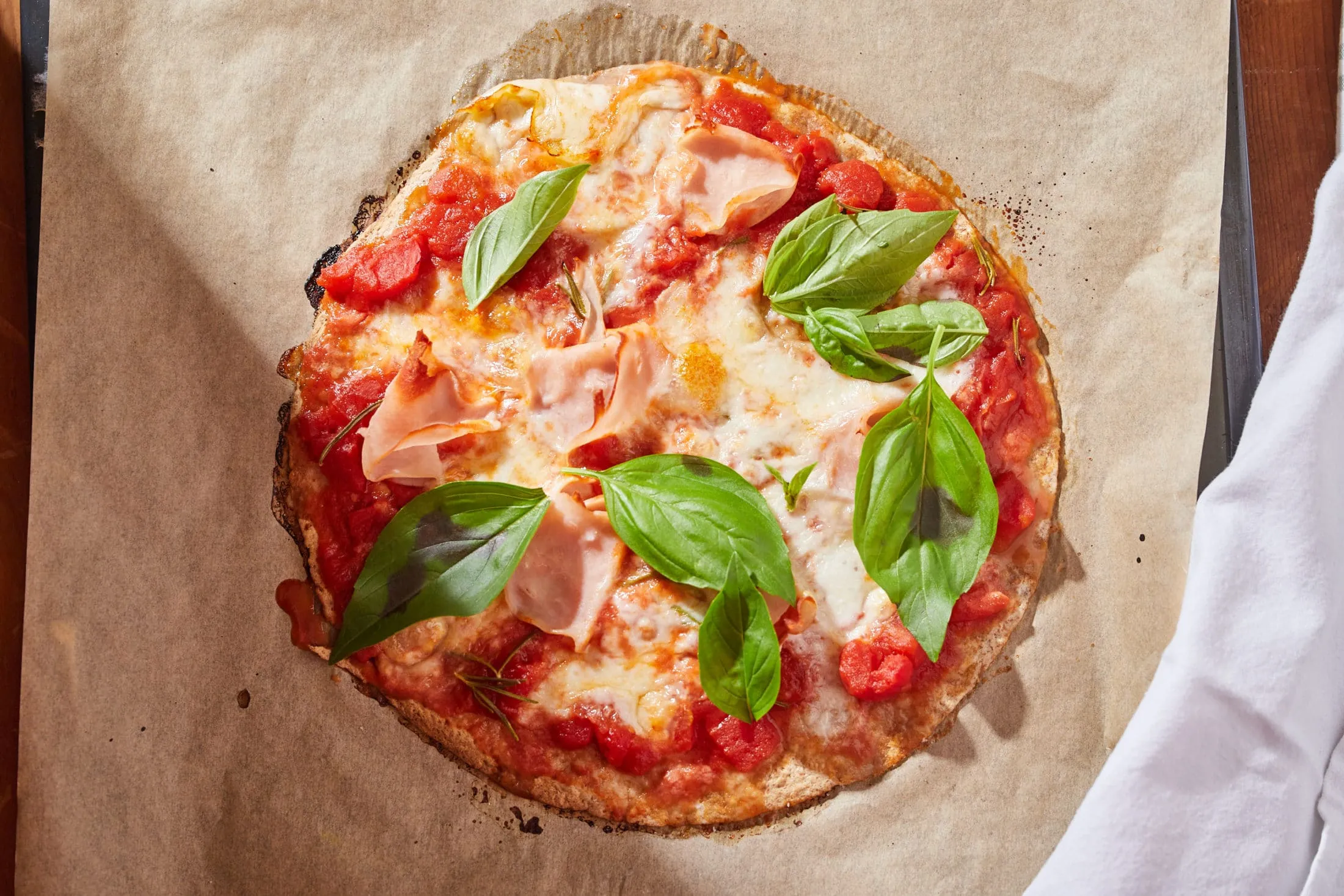 A tortillapizza elkészítéséhez a darabolt paradicsomot sózzuk, borsozzuk, majd megkenjük vele a tortillákat. Rácsipkedjük a rozmaringleveleket, rátépkedjük a sajtot és a pulykamellsonkát. Sütőpapírral bélelt tepsire rakjuk, és 200 fokra előmelegített sütőben 15-20 perc alatt készre sütjük. Bazsalikomlevelekkel tálaljuk.