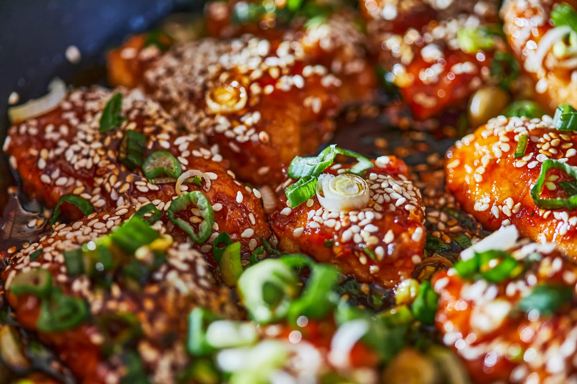 A húst visszadobjuk a serpenyőbe, majd ráöntjük a szószt és összemelegítjük. Végül megszórjuk szezámmaggal és vékonyra szeletelt újhagymával, majd főtt rizzsel tálaljuk.