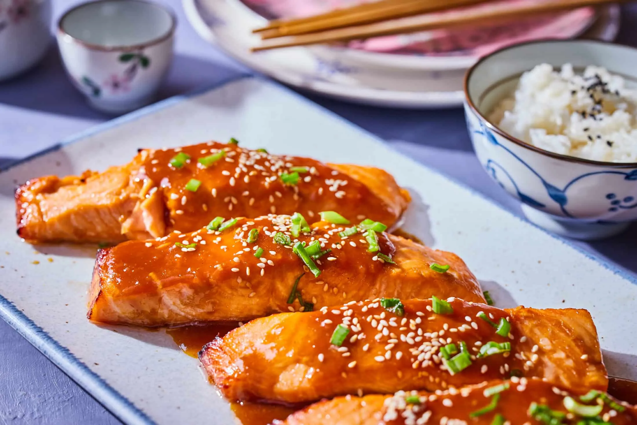 A megmaradt pácolólevet egy gyorsforralóban közepes lángon felforraljuk és besűrítjük, A megsült lazac szeleteket ezzel a sűrű mázzal megkenve tálaljuk. Megszórjuk szezámmaggal és aprított újhagymával, és gőzölt jázmin rizzsel tálaljuk.