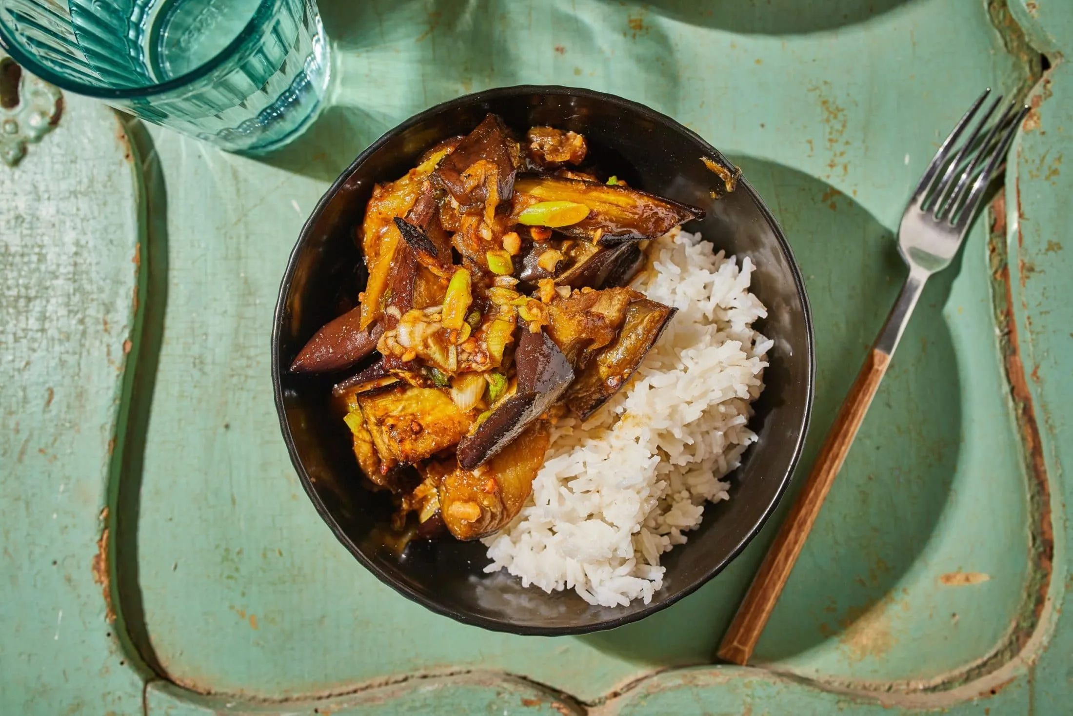 Közben egy serpenyőben 3-4 perc alatt összeforraljuk a szósz hozzávalóit, majd hozzáadunk egy kevés vízzel elkevert keményítőt, és ha besűrűsödött, beledobjuk az elősütött padlizsánt. További 2-3 percig rotyogtatjuk, majd megszórjuk apróra vágott újhagymával, illetve mogyoróval, és rizzsel tálaljuk.
