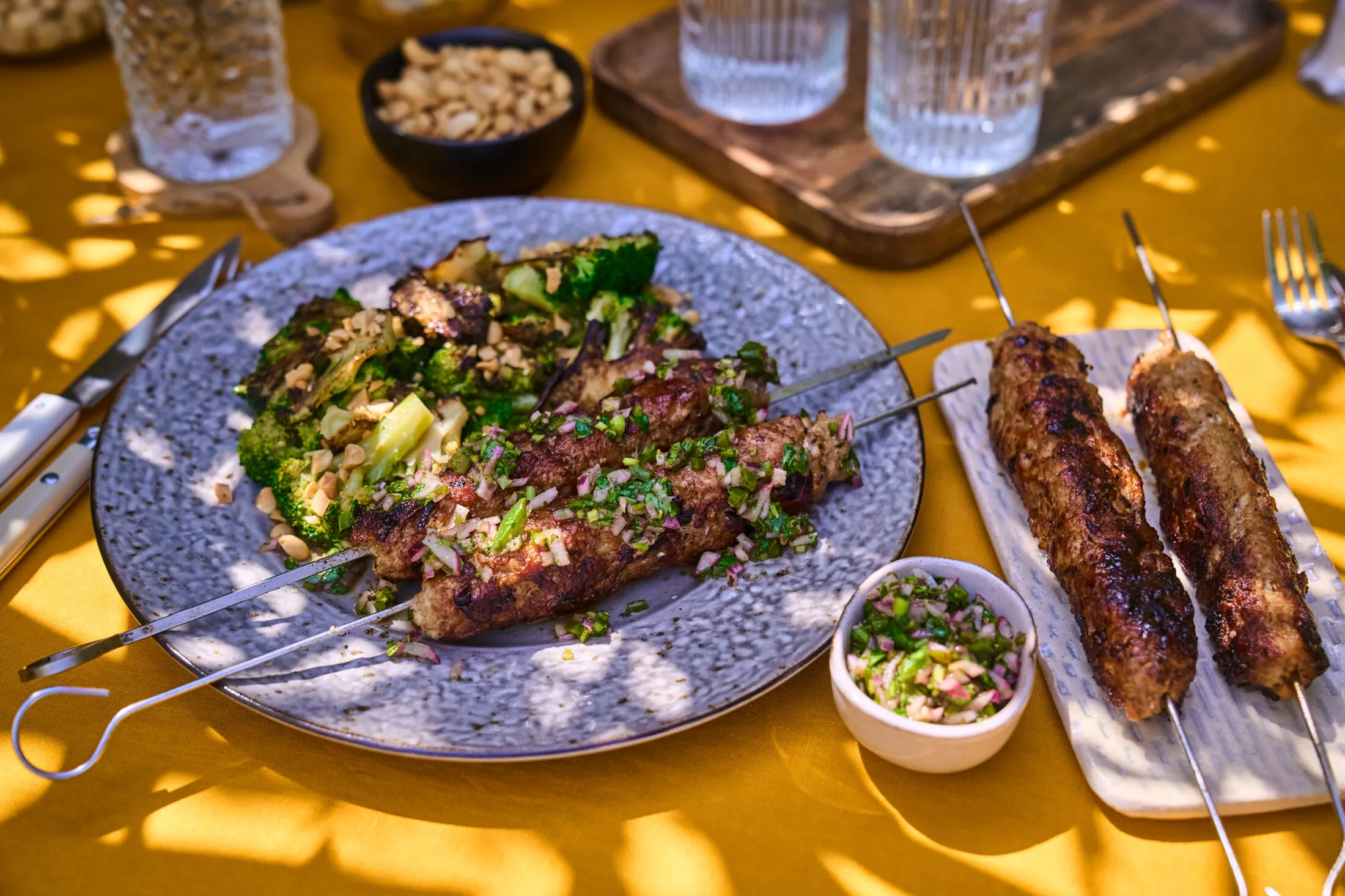 Tálalásnál tányérra szedünk a brokkoliból, megszórjuk aprított mogyoróval, mellé tesszük a nyársakat és kanalazunk rá a salsából.
